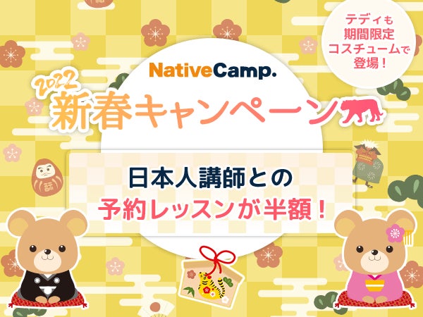 オンライン英会話アプリ「ネイティブキャンプ英会話」を展開する株式会社ネイティブキャンプ(東京都渋谷区 代表取締役:谷川国洋)は「2022年新春キャンペーン」として、日本人講師との予約レッスンを毎日半額で提供いたします。