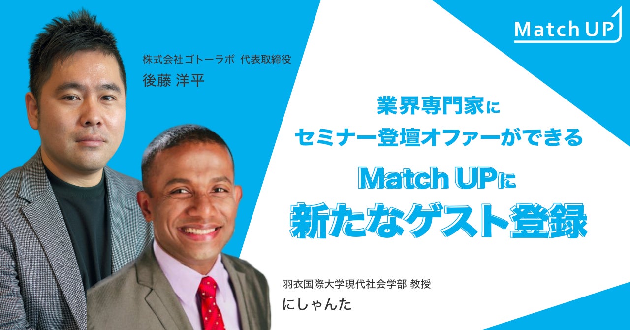 業界専門家にセミナー/イベント登壇のオファーができる「Match UP」、株式会社ゴトーラボ後藤洋平氏、羽衣国際大学 教授にしゃんた氏などが新たにゲスト登録!