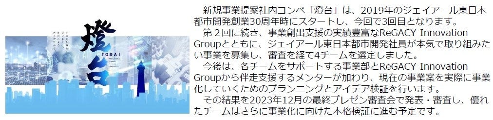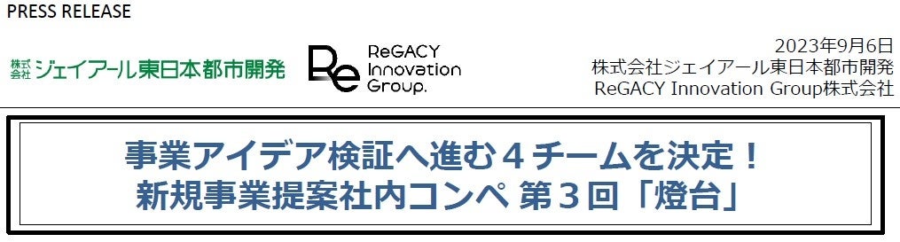 株式会社ジェイアール東日本都市開発(本社:東京都渋谷区、代表取締役社長:根本 英紀、以下 ジェイアール東日本都市開発)とReGACY Innovation Group株式会社(本社:東京都千代田区、代表取締役:成瀬 功一、以下 ReGACY Innovation Group)は、新規事業提案社内コンペ第3回「燈台」を実施しています。