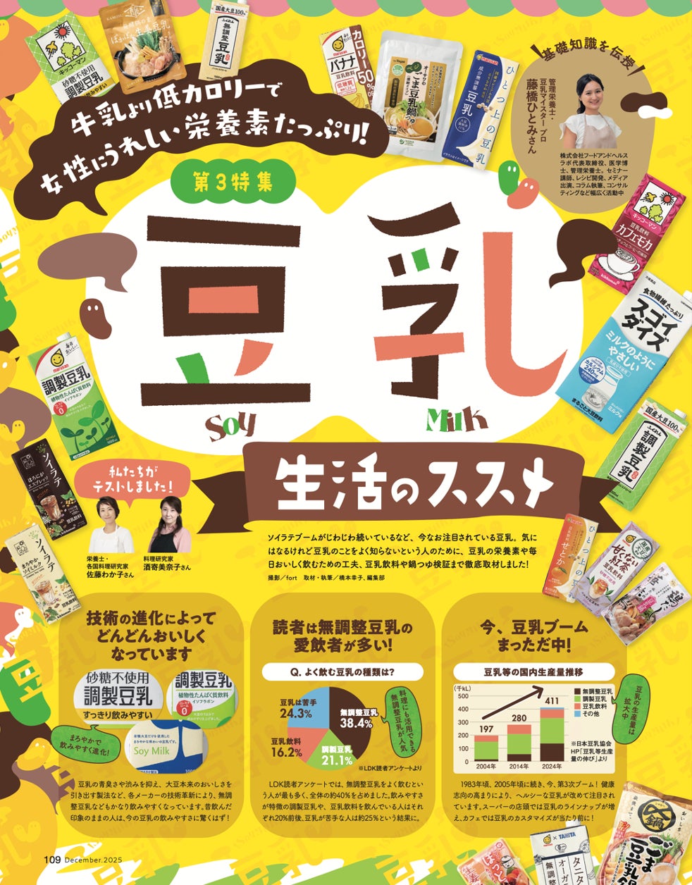 ソイラテブームがじわじわ続いているなど、今なお注目されている豆乳。気にはなるけれど豆乳のことをよく知らないという人のために、豆乳の栄養素や毎日おいしく飲むための工夫、豆乳飲料や鍋つゆ検証まで徹底取材しました!