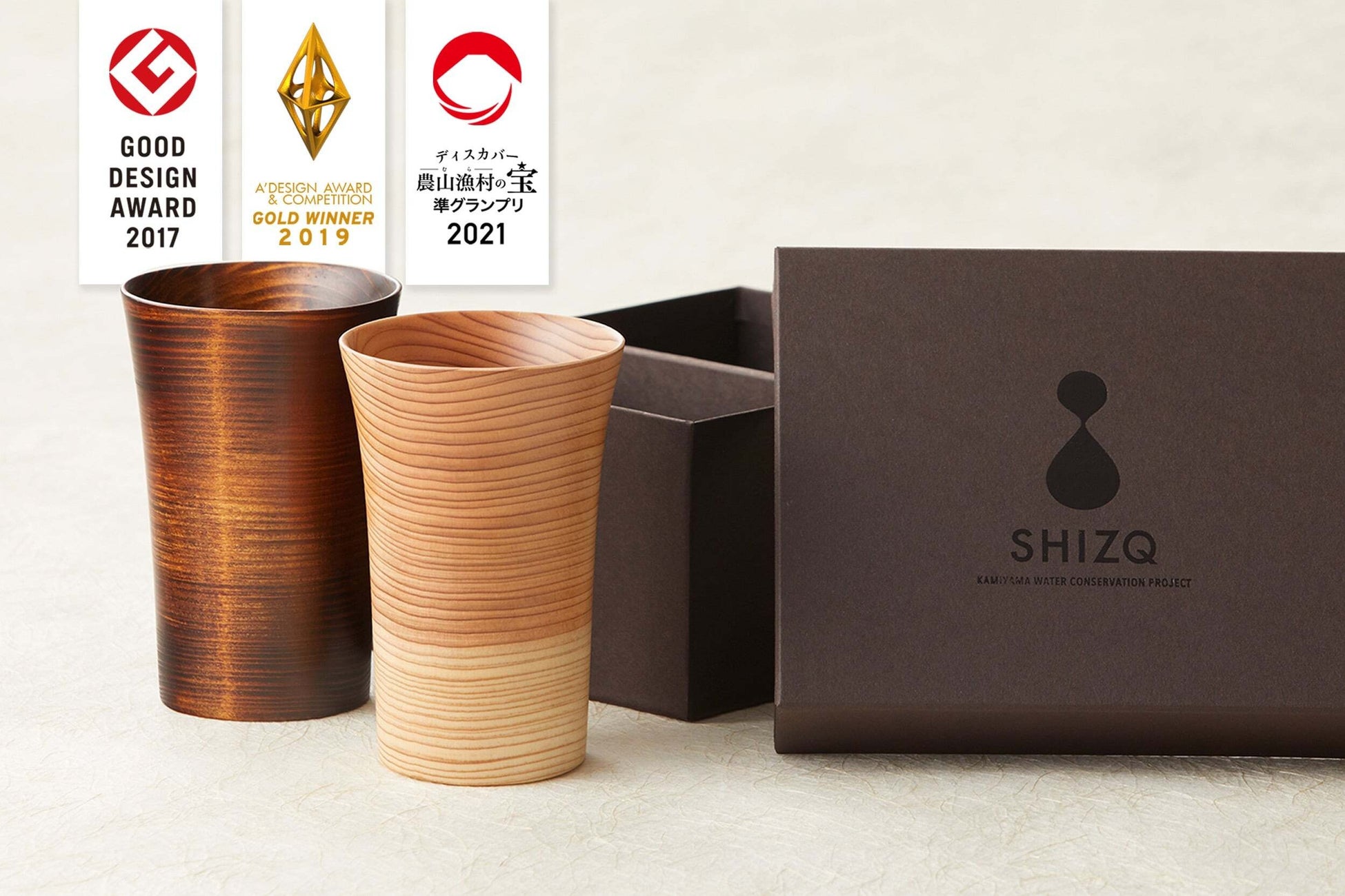 輸入競争により価値が下がってしまった国産の杉に新たな価値を与えたいという思いで生まれたのが、杉を削り出して作る器、SHIZQ(しずく)シリーズです。杉は幹の密度が低く、乾かすと空洞が多い木材のため、削り出して器を作るのは非常に難しいと言われていましたが、地元の木工職人たちの尽力により実現。空洞の多い構造を活かすことで飲み物が冷めにくく、口当たりも滑らかな器に仕上がり、GOOD DESIGN賞も受賞しました。