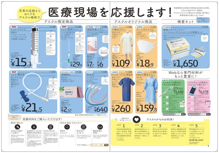 新型コロナが5類に移行し少しずつ日常が戻りつつある中で、今冬はインフルエンザが猛威を振るっています。引き続き多忙な医療現場を品揃えと価格で応援すべく、今号では、「医療現場を応援します!」と題して特集しています。あらゆる医療現場に支持される、アスクルオリジナル・限定販売商品の中でもおすすめ定番品を掲載。シリンジ、翼状針、輸液セットの他、不織布ガウンにサージカルマスクなど、現場を支える定番品を安心の品質とお求めやすい価格で紹介しています。