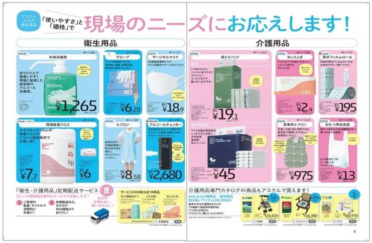 同時に、介護施設や薬局の専門用品からオフィスや教育機関の衛生・健康管理用品まで約6,100アイテムを掲載した「衛生・介護用品カタログ」、注射器や衛生用品をはじめとした医療材料、医療用事務用品など医療機関向けの専門商品約9,200アイテムを掲載した「医療機関向けカタログ」を発刊します。