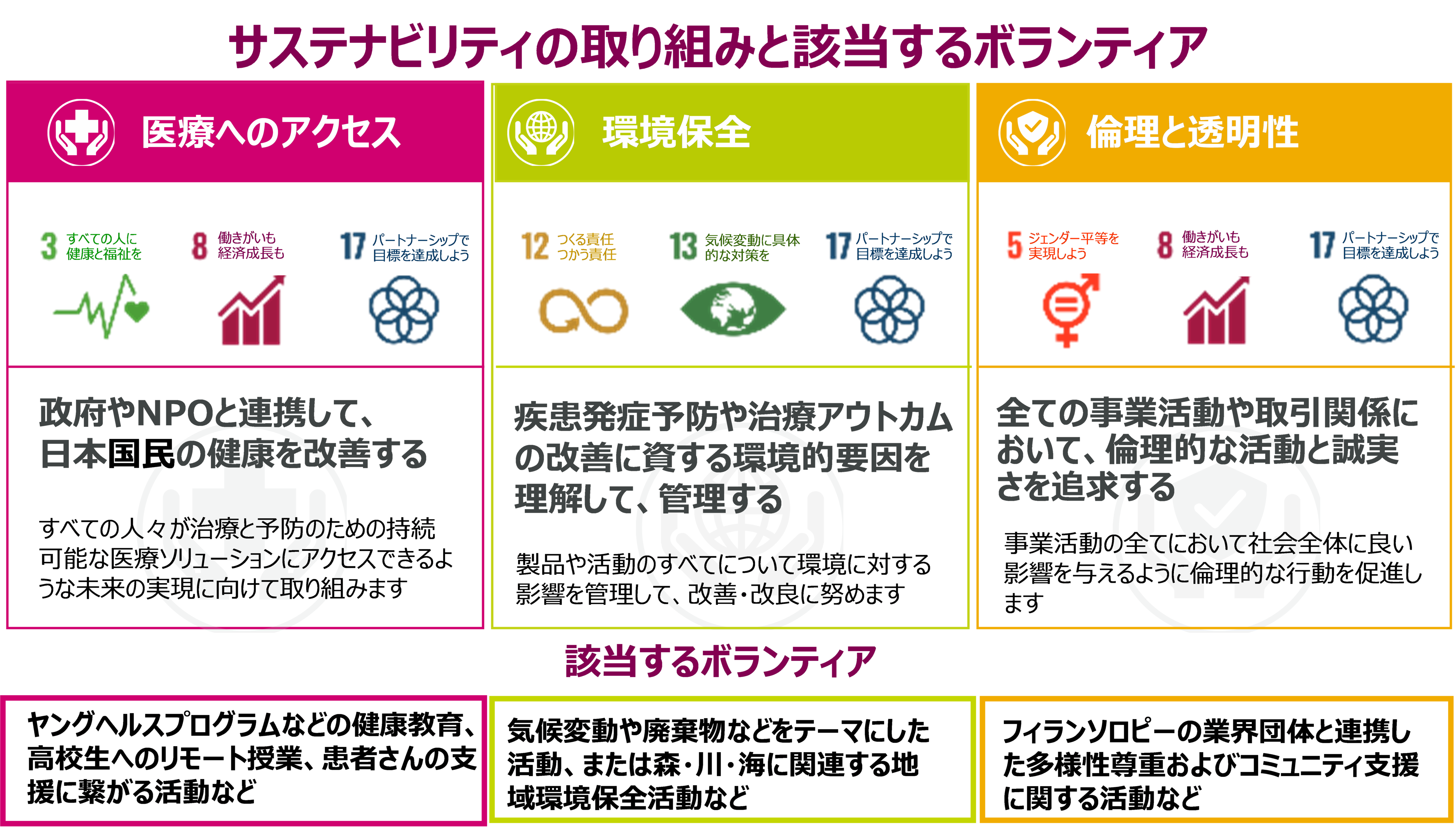 アストラゼネカは、「医療へのアクセス」「環境保全」「倫理と透明性」の3つの分野をサステナビリティの優先事項とし、ステークホルダーである患者さん、社員、環境および地域社会の健康に資する活動に取り組んでいます。この3つの分野は、国連が策定する持続可能な開発目標(SDGs)に則しており、各分野に該当するボランティア・プログラムを展開していきます。