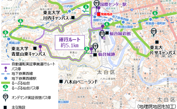 ■運行区域: 「青葉山グリーン回遊プロジェクト」の停留所(仙臺緑彩館、国際センター駅、および仙台城跡)と東北大学片平キャンパス北門の間で運行予定