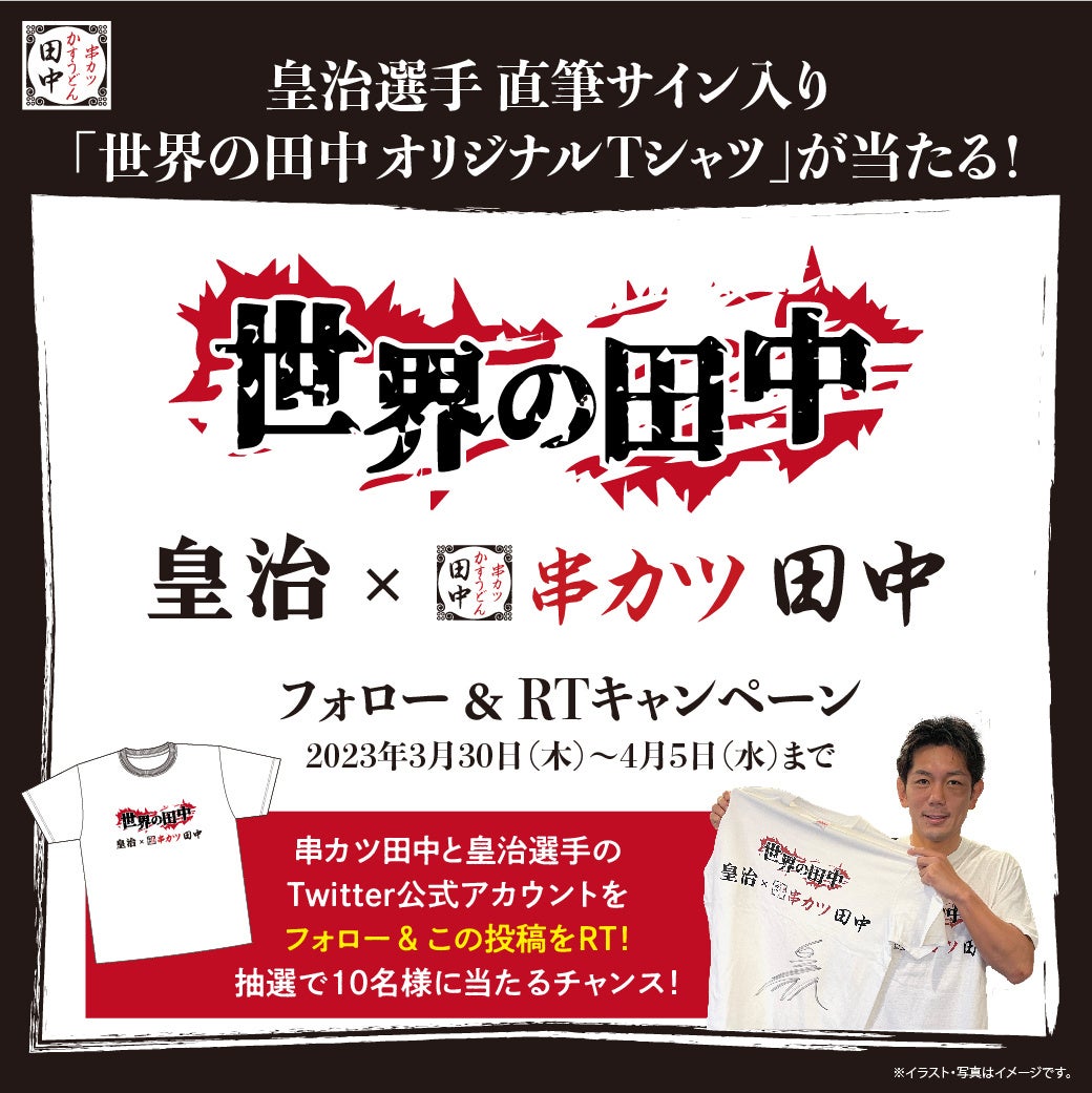 本キャンペーンでは、皇治選手と串カツ田中の公式Twitterアカウントをフォローし、該当ツイートをリツイートした方の中から抽選で10名様に、皇治選手の直筆サイン入り「世界の田中オリジナルTシャツ」をプレゼントいたします。