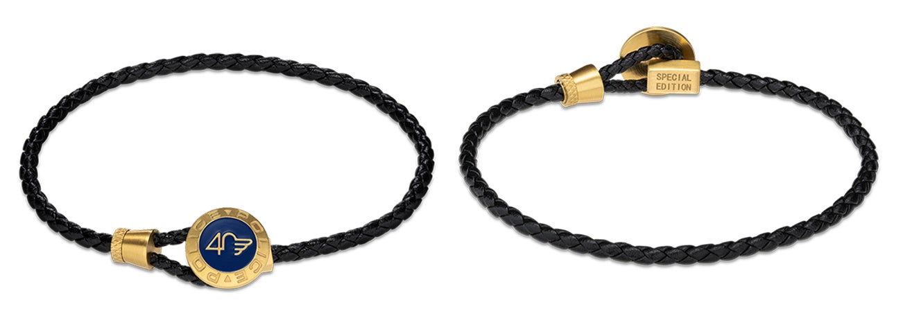 繊細に編み上げたレザーコードのブレスレットは、40thのロゴをエンブレムのようにあしらった留金をループで留める仕様。カジュアルなデザインにエレガントな要素を加えることでブランドの歴史を感じさせます。