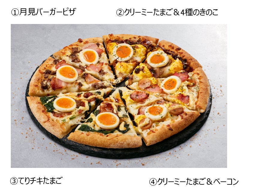 「月見クワトロ」は、まるでお月様のような“まんまるたまご”と、“ふわふわたまご”をトッピングした、見た目にも華やかなたまご尽くしの商品です。昨年に引き続き、今年も月見ピザファンの皆さまの熱い要望にお応えし、4種類の味わいを1枚で楽しめる「月見クワトロ」を2024年9月9日(月)より数量限定で発売します。