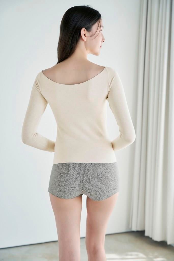 8分袖×首回りワイド×適度な着丈で見せずにあたたか。