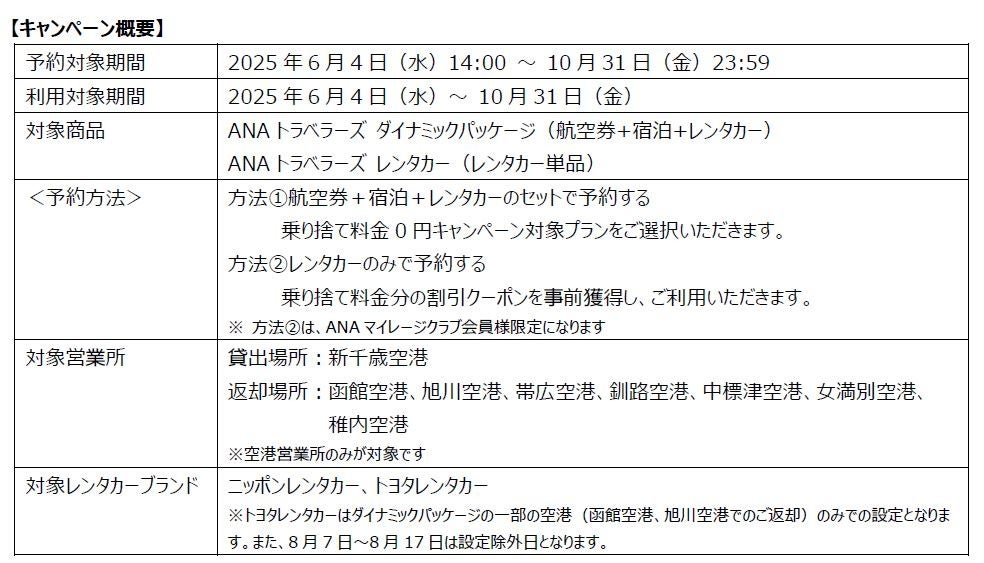 ANA X株式会社(代表取締役社長:神田 真也、本社:東京都中央区、以下「ANA X」)は、2025年6月4日(水)~ 10月31日(金)の期間、「北海道レンタカー乗り捨て料金0円キャンペーン」を実施いたします。新千歳空港でレンタカーを借り、北海道内の他空港でご返却いただくと、通常は最大で17,600円程度かかる乗り捨て料金が無料になります。