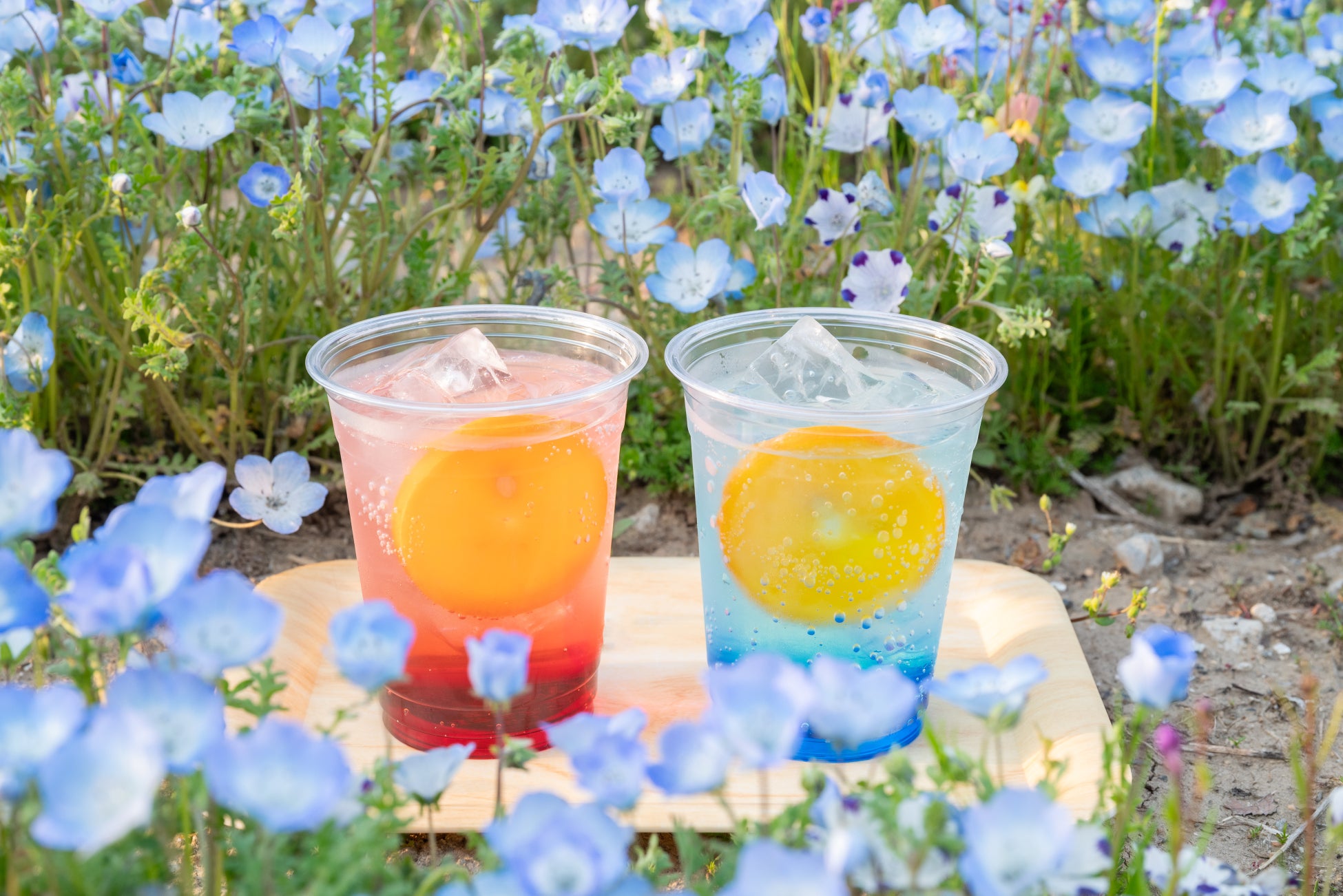 また、花木園売店にて提供されている「ポピーソーダ・ネモフィラソーダ」は、透き通る赤色と青色のソーダでシュワっと爽やかな飲み心地が、散歩の疲れを癒してくれます。