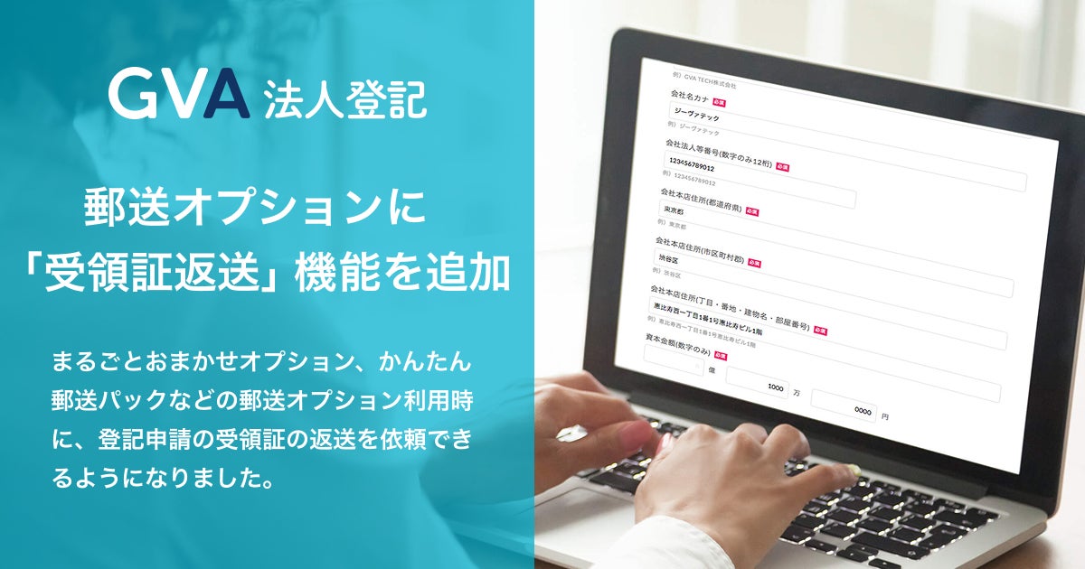 リーガルテックサービスの開発・運営を行うGVA TECH株式会社(本社:東京都渋谷区、代表取締役:山本 俊)が運営するオンライン商業登記支援サービス「GVA 法人登記」にて、「まるごとおまかせオプション」「かんたん郵送パック」などの郵送オプション利用時に、登記申請の受領証の返送依頼ができる機能を追加したことをお知らせいたします。