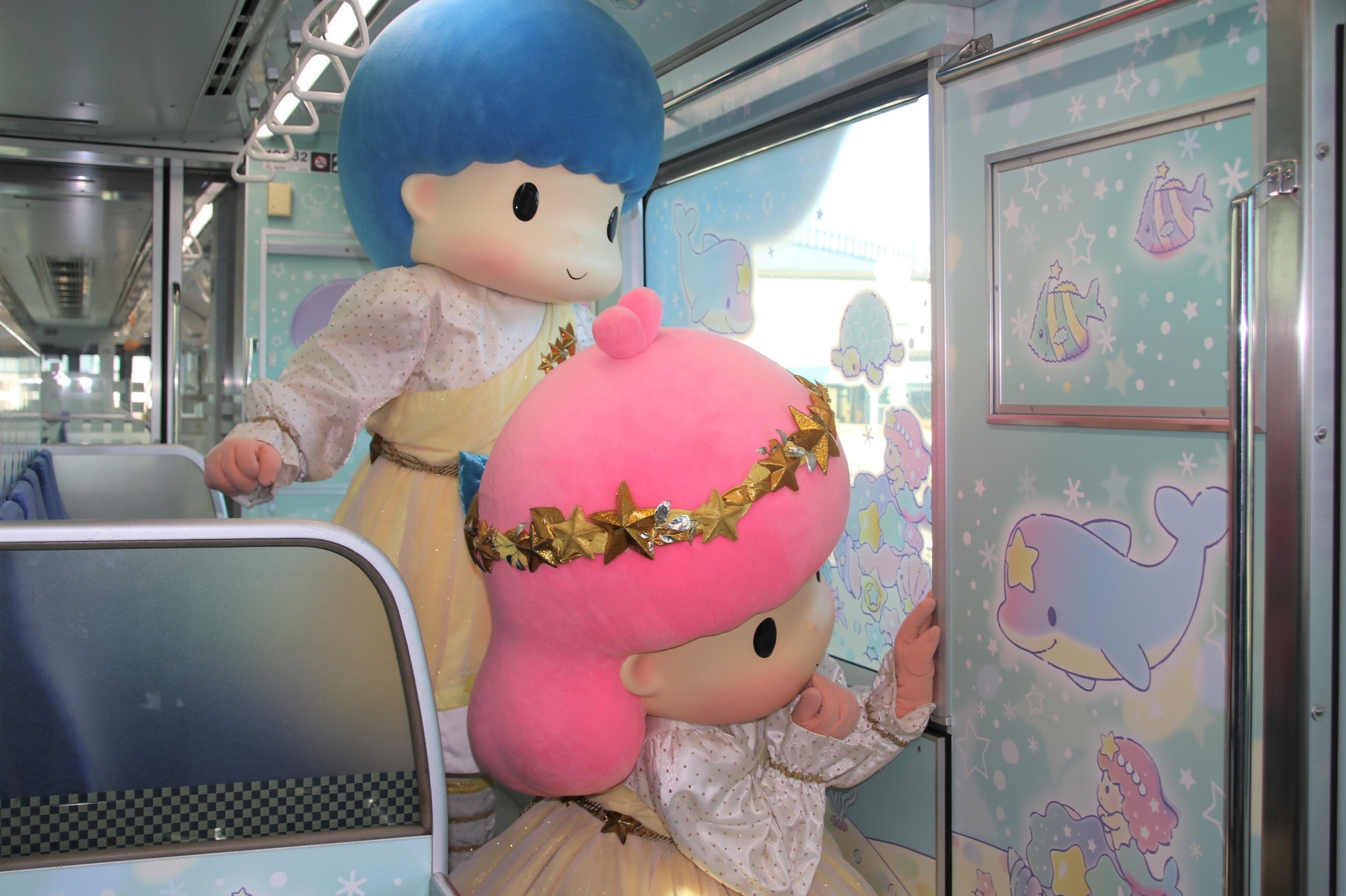 2021年11月から運行している「キキ&ララ モノレール」トゥインクルツアー編成の車内は四季がテーマ。いるかさんやぺんぎんさんのようなキキ&ララの珍しいおともだちも登場して、それぞれの季節の装飾(1号車=春、2号車=夏、5号車=秋、6号車=冬)を彩ります。もうひとつのキラキラスター編成は1、6号車の運転台付近がフルラッピングされています。異なる2編成のデザインをお楽しみください。