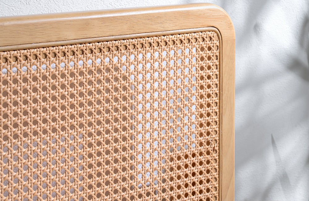 ヘッドボードとフットボードにラタン調デザインを採用しており、ラタンならではの美しい編み目を贅沢に楽しめるベッドフレームとなっています。自然な風合いでお部屋に馴染みながらも、編み目が作る立体感が寝室にほどよいアクセントを与えてくれます。