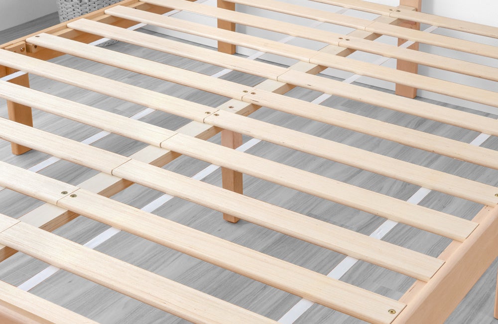 フレームには天然木ラバーウッドを使用しており、寝室をぬくもりのある空間に仕上げることができます。また通気性抜群のすのこを採用しているので、梅雨のジメジメや寝汗で湿気が溜まりがちな寝床内も通気性の高いすのこを採用することにより年中快適に眠ることが可能です。