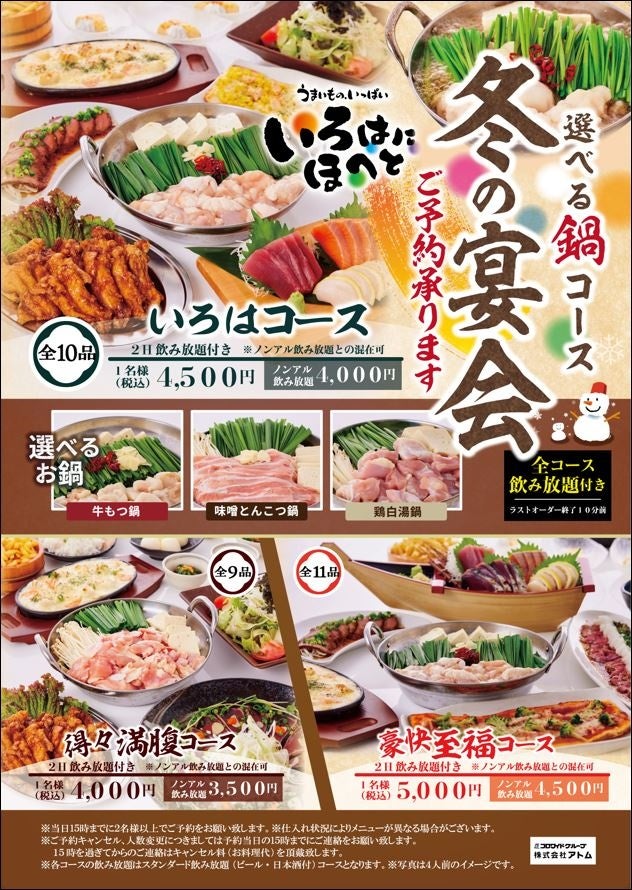アトム・いろはにほへと「早いご予約が断然お得!冬の宴会&鍋とうまいもんスタート」