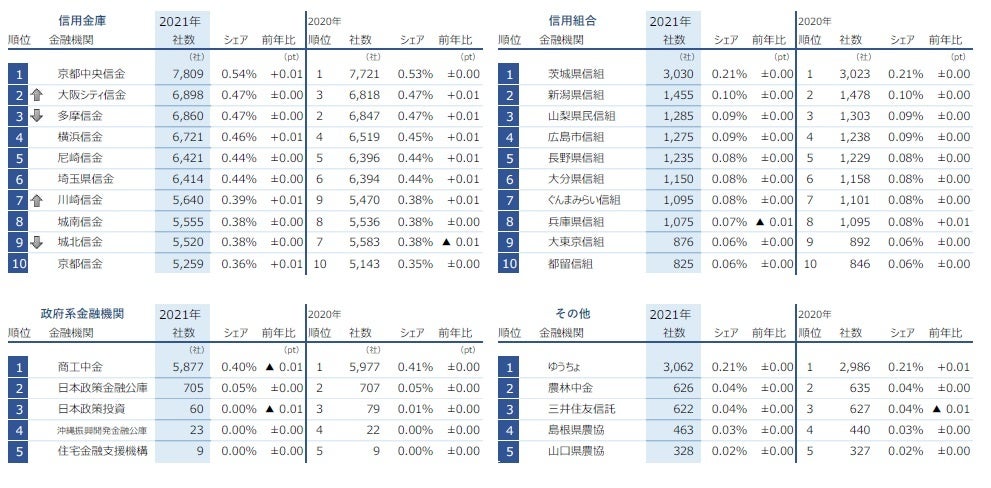他方、全国で3メガを含む「都市銀行」のシェアは19.54%で、前年を0.24pt下回り過去最低を更新した。シェアの低下幅は2009年以来過去最大で、都市銀行全体ではシェア縮小の傾向が続く。「第二地方銀行」(シェア9.67%)は3年連続で1割を下回り、2年ぶりに前年から縮小したほか、シェア低下幅は全業態で最大となった。「信用組合」(シェア2.46%)は2年連続でシェアが低下している。