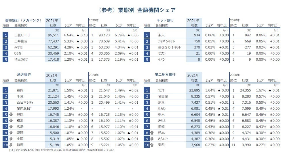 - 2021年の全国メインバンク社数トップは「三菱UFJ銀行」となった。企業数は9万6511社となり、2009年の調査開始以降13年連続のトップ。ただ、都市銀行(メガ)上位3行のメイン社数は昨年比で計約3700社、シェアにして計0.24ptの減少となり、メイン社数の減少が進んでいる。地方・第二地方銀行では、上位60行のうち「北洋銀行」(2万3895社)が最多。「第四北越銀行」のメイン社数は1万7993社(シェア1.24%)で、北陸4県に拠点を置く地方銀行として初めて上位10行入りした