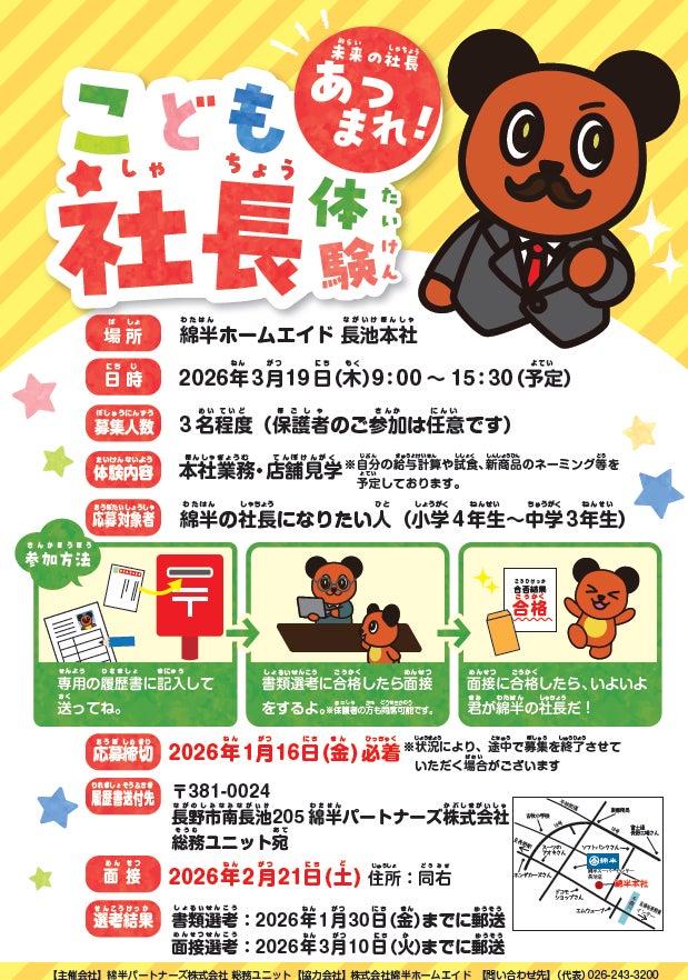 株式会社綿半ホームエイド(長野県長野市 代表取締役社長:永岡幸春)は、小学4年生から中学3年生を対象にした体験型プログラム「こども社長体験」を実施します。