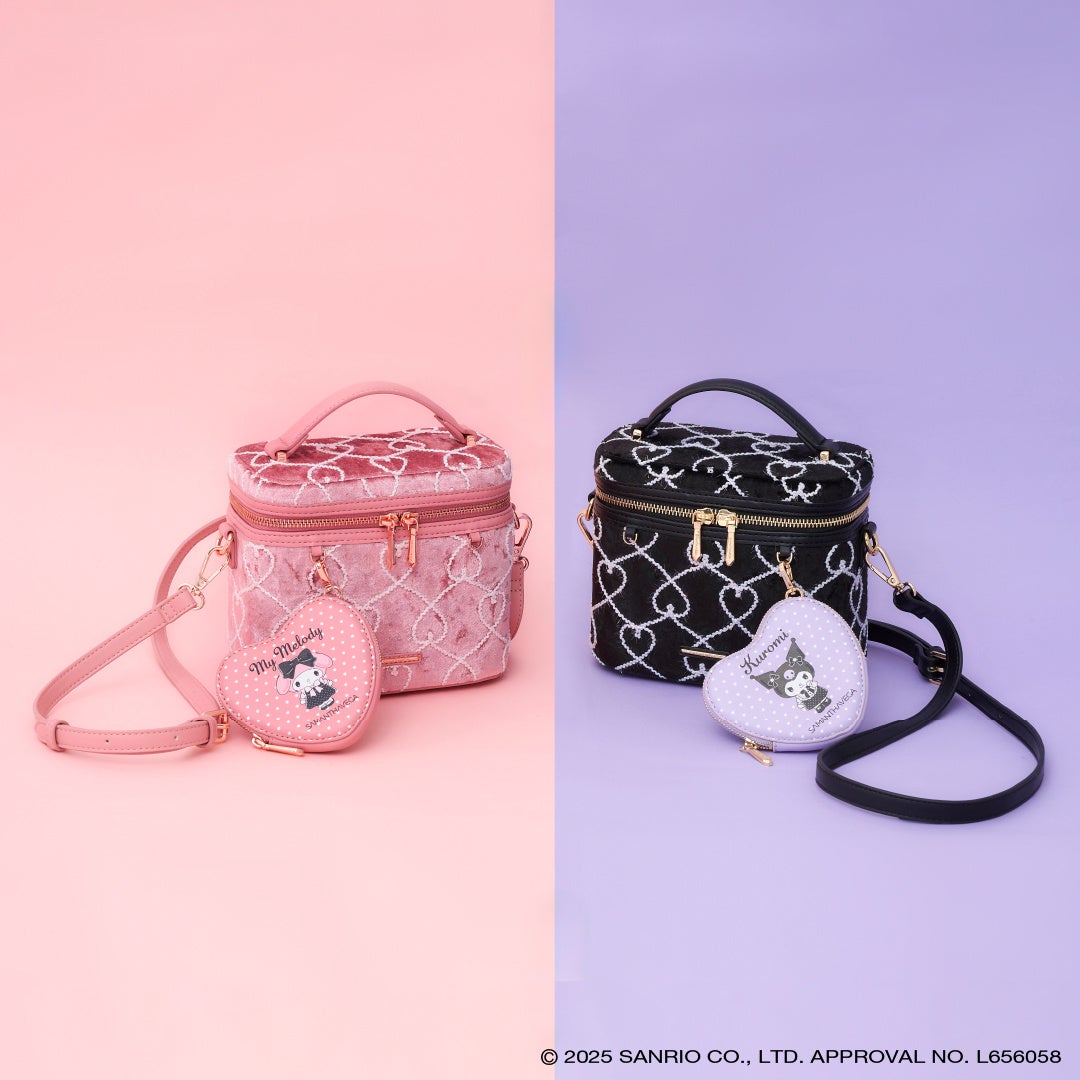 コロンとした丸いフォルムが可愛いバニティ型バッグに、「マイメロディ」と「クロミ」のモチーフやイメージをそれぞれデザインに落とし込んだアイテム。