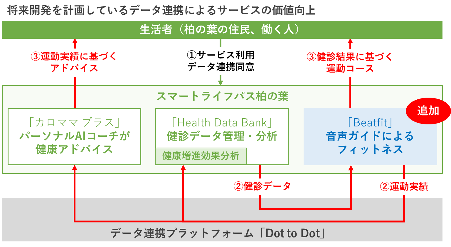 さらに、将来的には、スマートライフパスを通じて他のサービスと連携した価値創造を目指してまいります。すでにサービス提供が開始されている事業者様が持つ健康診断情報などと連携することで、より個人に最適化された運動メニューの提供を行う予定です。これら一連のサービス提供を通じて、利用者の健康増進効果を検証します。