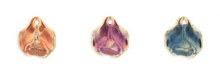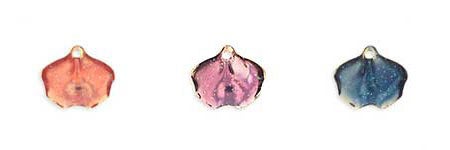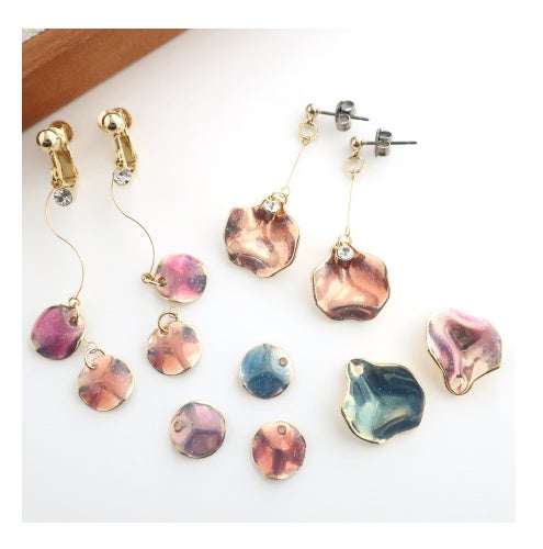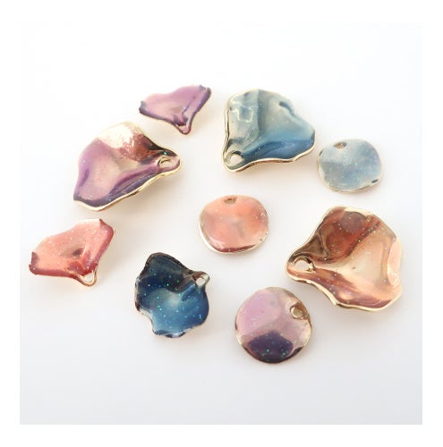 グリッターがきらめく、透明感のあるカラーのエポ加工で着色したメタルパーツ。