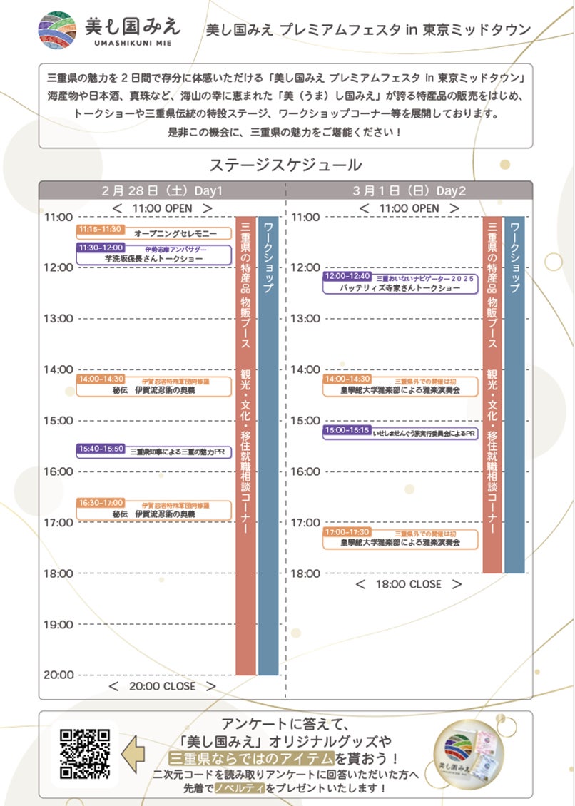 トークショー(伊勢志摩アンバサダー 芋洗坂係長さん・三重おいないナビゲーター2025 バッテリィズ寺家さん)や伊賀忍者特殊軍団阿修羅によるショー、雅楽演奏(皇學館大学雅楽部)、三重の魅力PR(三重県知事、いせしませんぐう旅実行委員会)など、三重の魅力を表現するステージイベントを実施します。