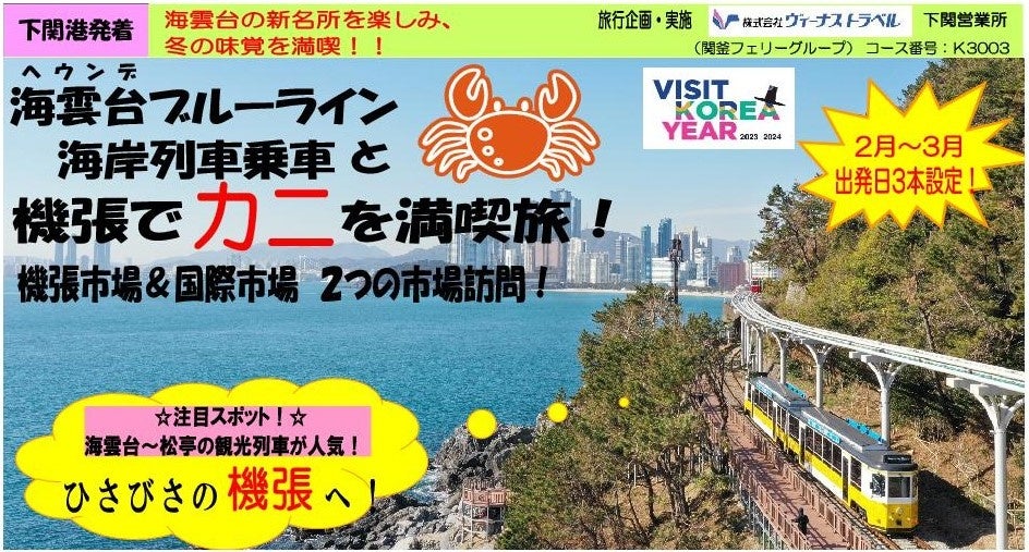 SHKライングループの旅行会社・株式会社ヴィーナストラベル(本社:大阪府大阪市、代表取締役:池田恒雄)は、下関港発着の往復関釜フェリー利用の釜山機張でカニのランチを満喫するツアーの販売を開始しました。