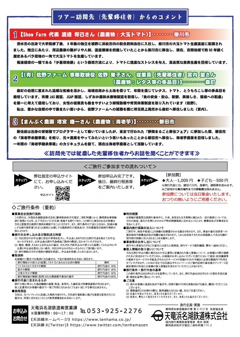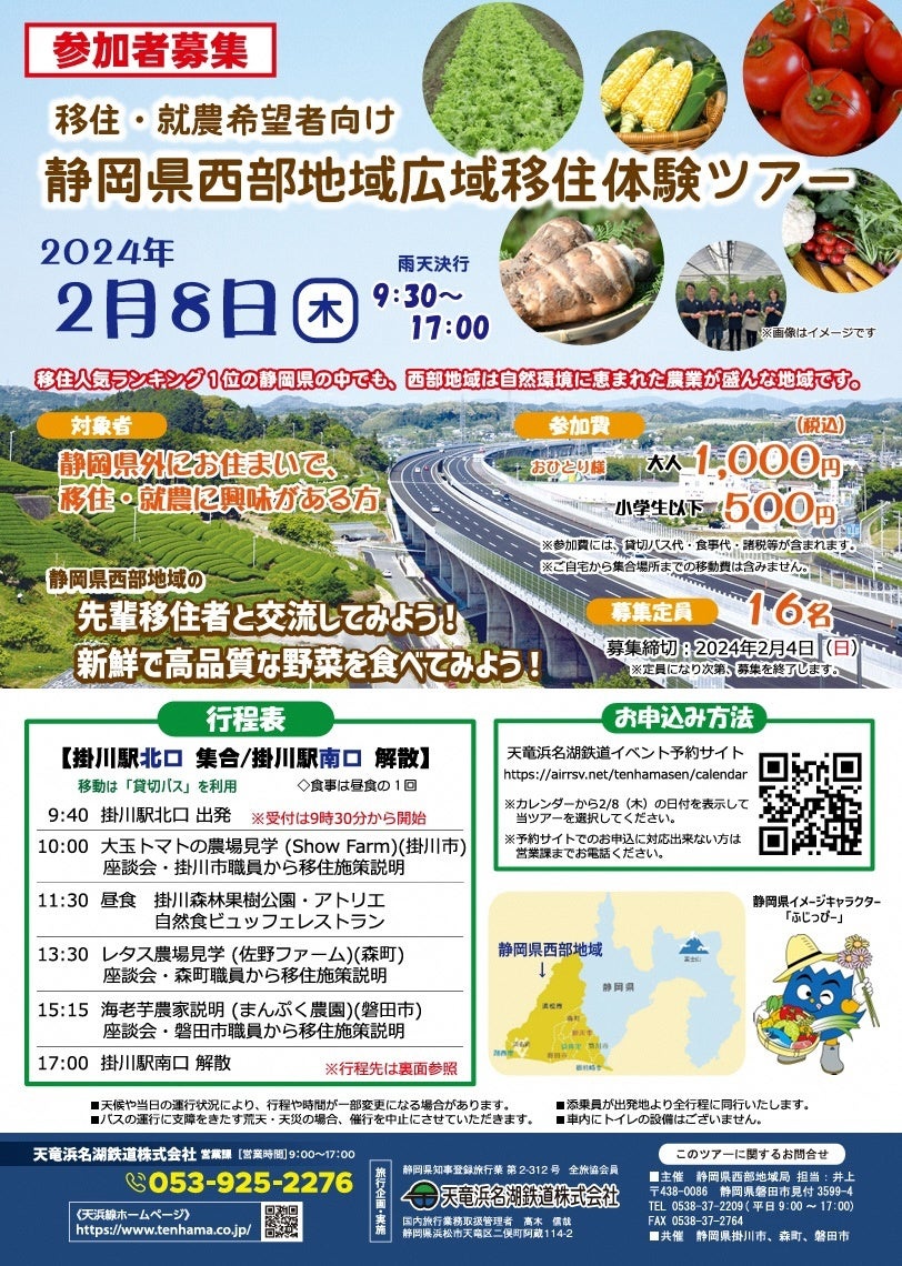 天竜浜名湖鉄道公式ウエブサイトの「イベント」から「静岡県西部地域広域移住体験ツアー募集について」を選択してください。
