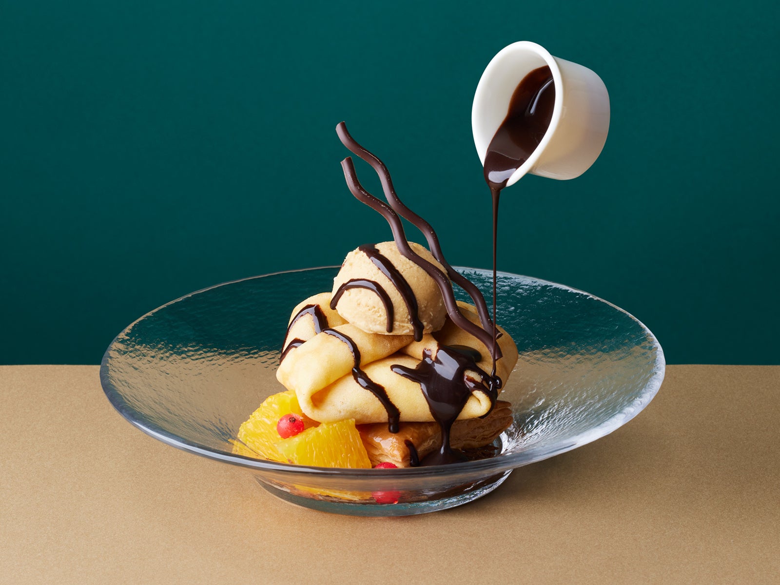 薄焼きのクレープ生地を細かく砕いたフィアンティーヌのサクサク食感、キャンディングアーモンドのカリッとした食感が、クリームの滑らかな舌触りにアクセントを加えます。濃厚な塩キャラメルアイスや爽やかに香るオレンジゼスト※1で風味の変化を、フェアトレードコーヒーを使用したコーヒーゼリーですっきりとした後味をお楽しみください。