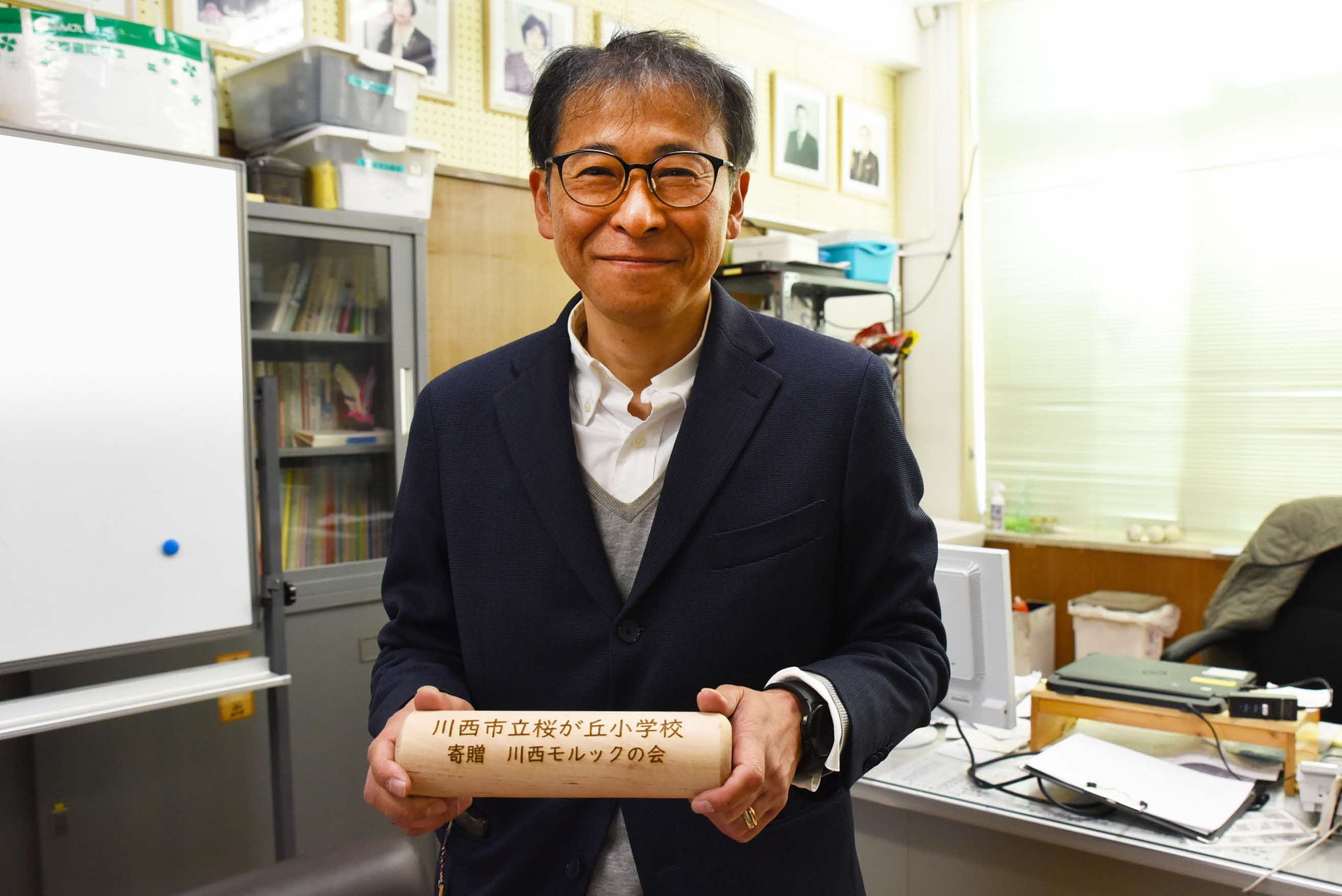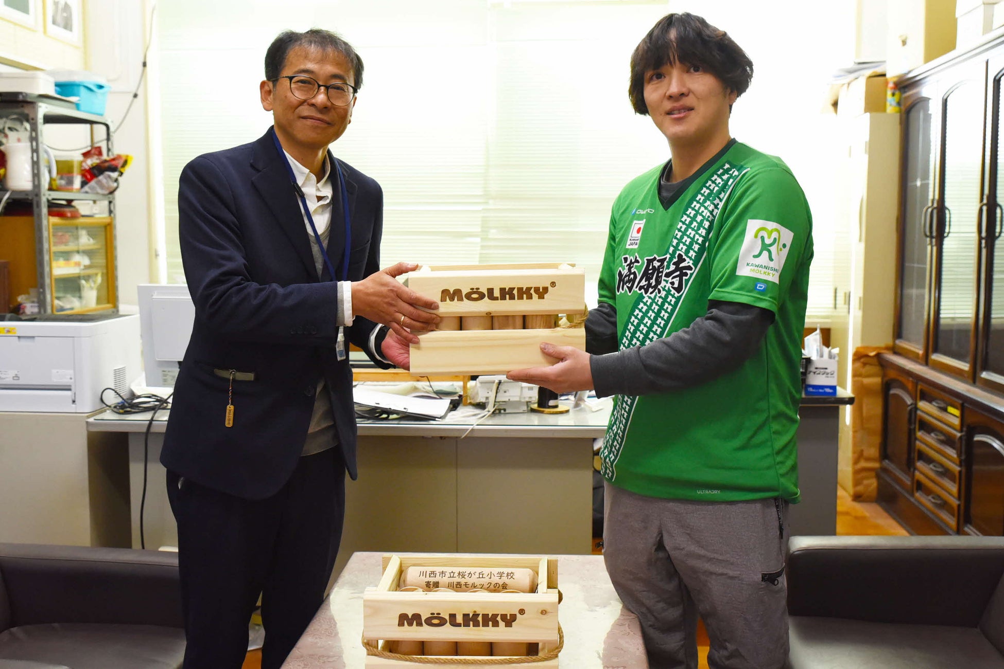 その第1号として、2月14日、川西市モルックの会代表の中 博司(なか ひろし)さんから、川西市立桜が丘小学校(川西市日高町4番1号)へ、2セットが手渡されました。