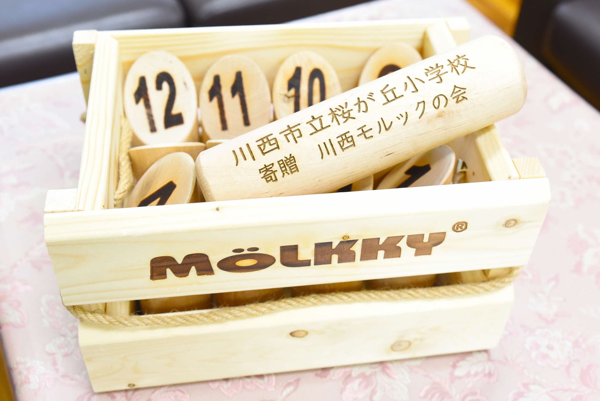 まずは市立桜が丘小学校(川西市日高町4)へ、川西モルックの会から2セットの寄贈がありました。