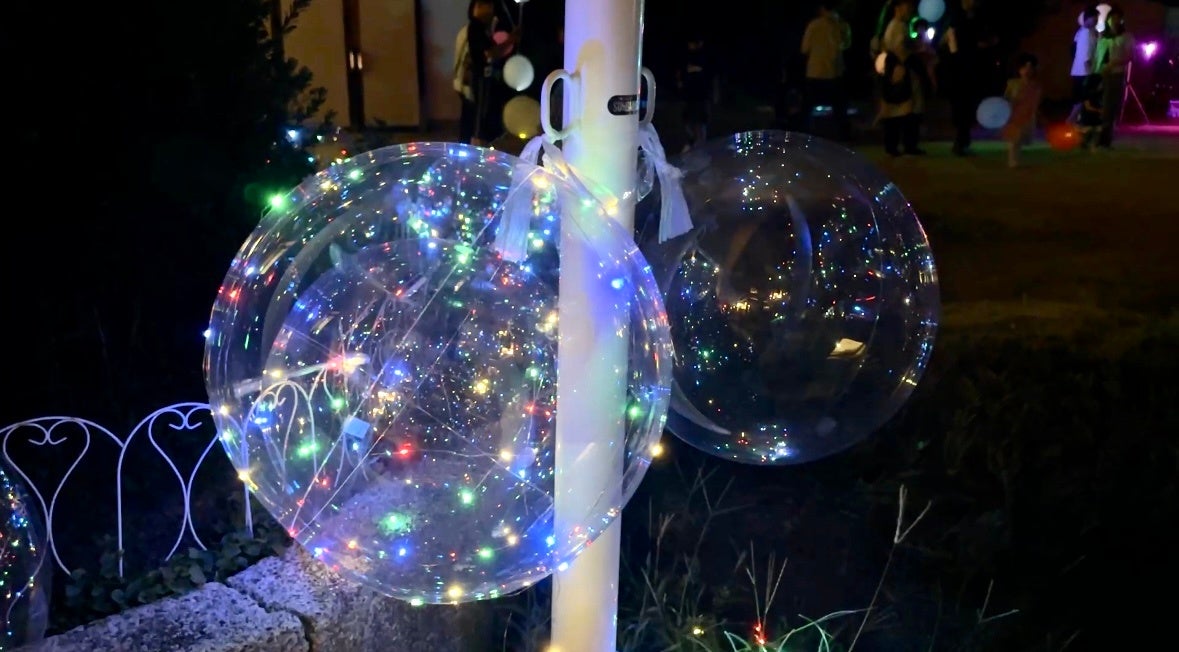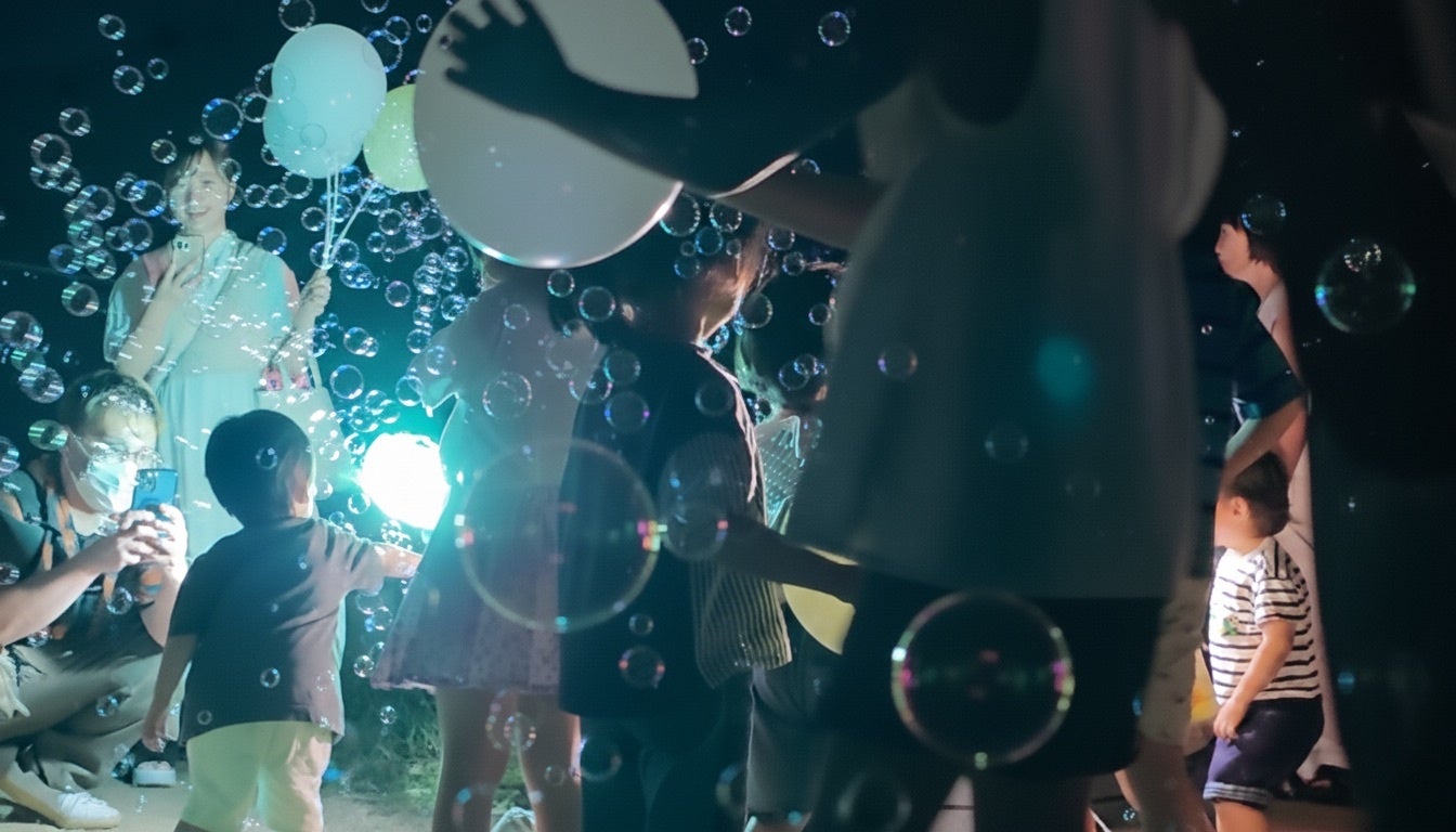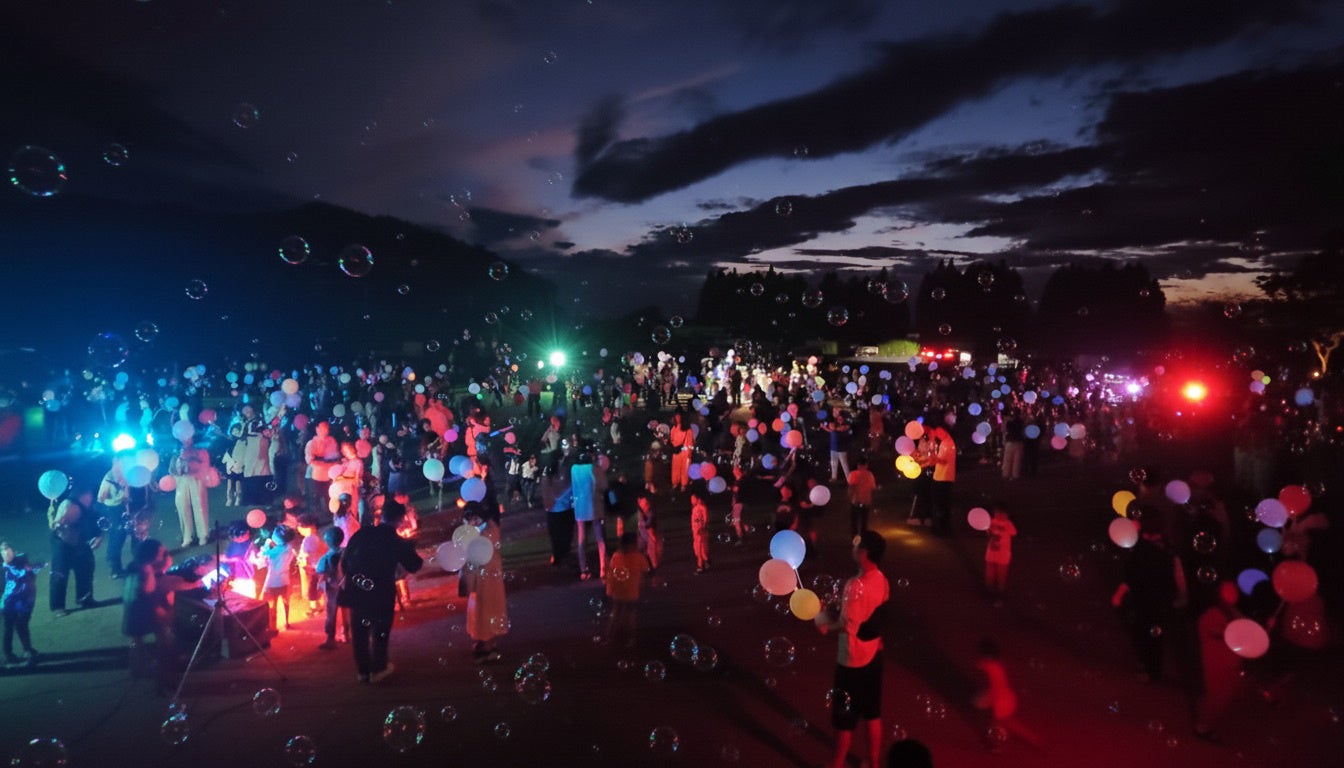 「Spark Art Night」は、光るバルーンやシャボン玉、スモーク、ダイナミックなライトショーを融合した大規模イルミネーションイベントです。旧尾崎小学校の校舎と校庭を舞台に、参加者全員が光るうちわを掲げ、会場全体がひとつのアート作品へと変貌しました。