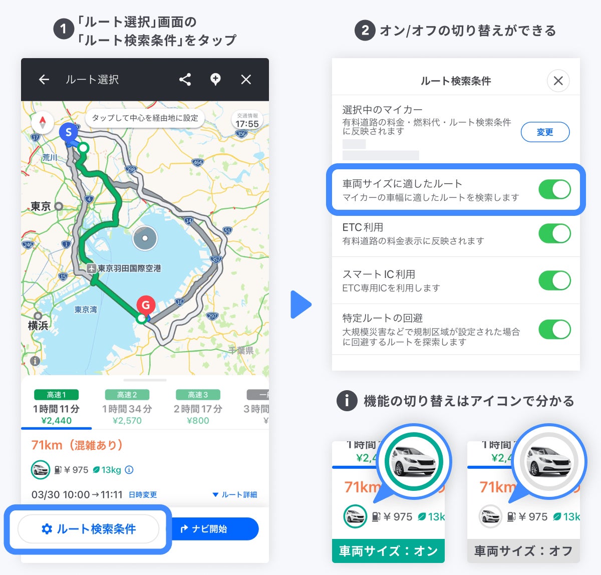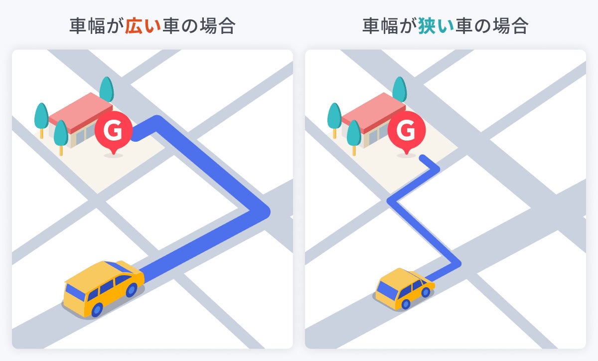 車幅の広い車には「広く通りやすいルート」、車幅の狭い車には「より近く早いルート」が検索結果に表示され、より快適な運転が可能に