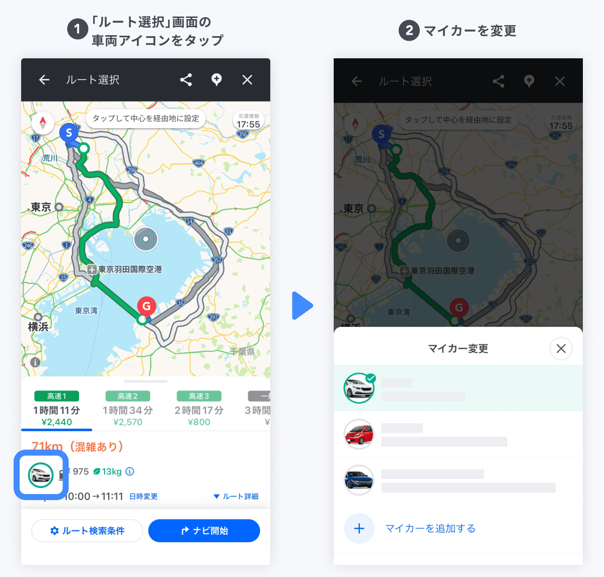 ・複数の車を「マイカー登録」している場合は、「ルート検索」結果画面で選択中の車がアイコンで表示されます。マイカーを変更したい場合は、アイコンをタップし、現在登録したい車のアイコンをタップします。