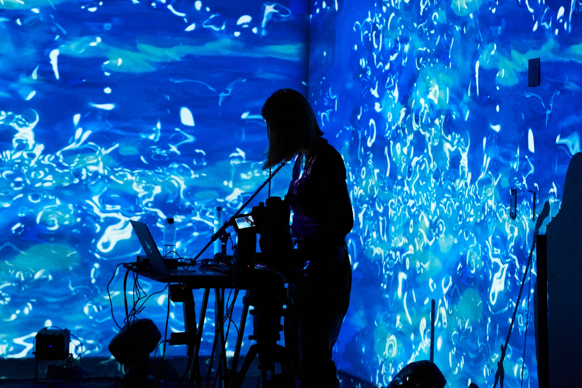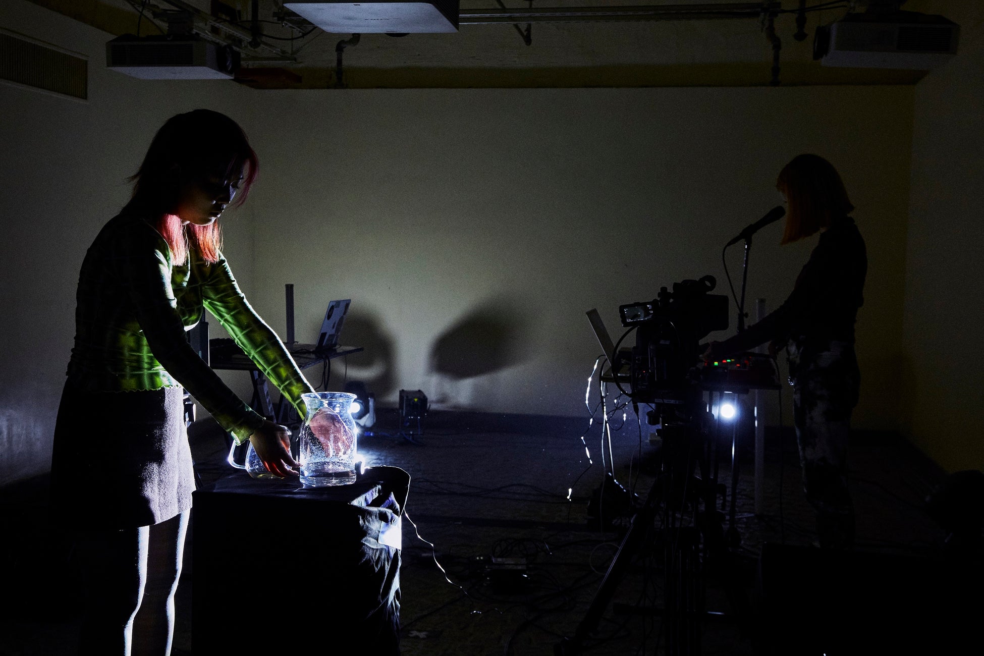 2月26日土曜日、21時。場所は工事中のGinza Sony Parkの一角。インダストリアルな光景を背に、tamanaramenのライブは始まった。Hanaがガラスのジャーに水を注ぎ、爪でそのジャーを引っ掻き水を掬うと、マイクで拾われたそのASMR的サウンドが会場に響き渡る。そして、向かい合うHikamとHanaの影が暗闇の中に浮かび上がり1曲目がスタート。五感に響き渡るような水音と鼓動のようなリズムに、まるで身体が洞窟の中にいるような、胎児のように包み込まれるような、不思議な感覚にとらわれる。まるで異次元にたどり着いたようなこの感覚こそが、tamanaramenの世界の始まりだった。