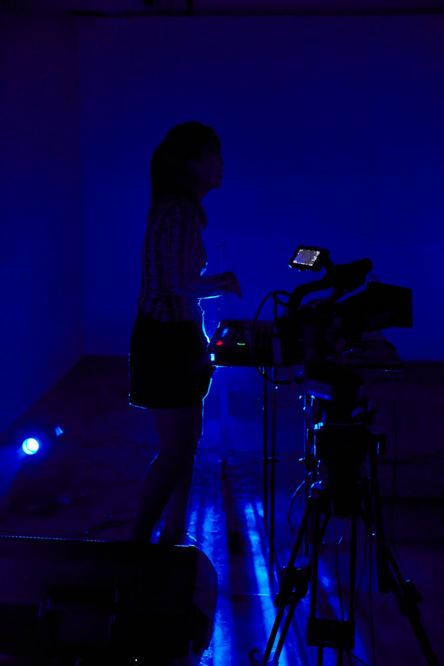 そして、流れるように2曲目へ突入。Hikamの呼吸が無機質な空間に響き渡る。3曲目では、Hikamの特徴的なウィスパーボイスでの朗読と、それを可視化するようなオーガニックな映像が打ちっぱなしのコンクリートに映し出される。痛みをテーマとした歌詞が映像の中へとろけ出す。壁に打ち出されるビジュアル、光、そして淡々と語りかける囁き声は人びとが感じる日々の痛みを緩めてくれるように融合する。