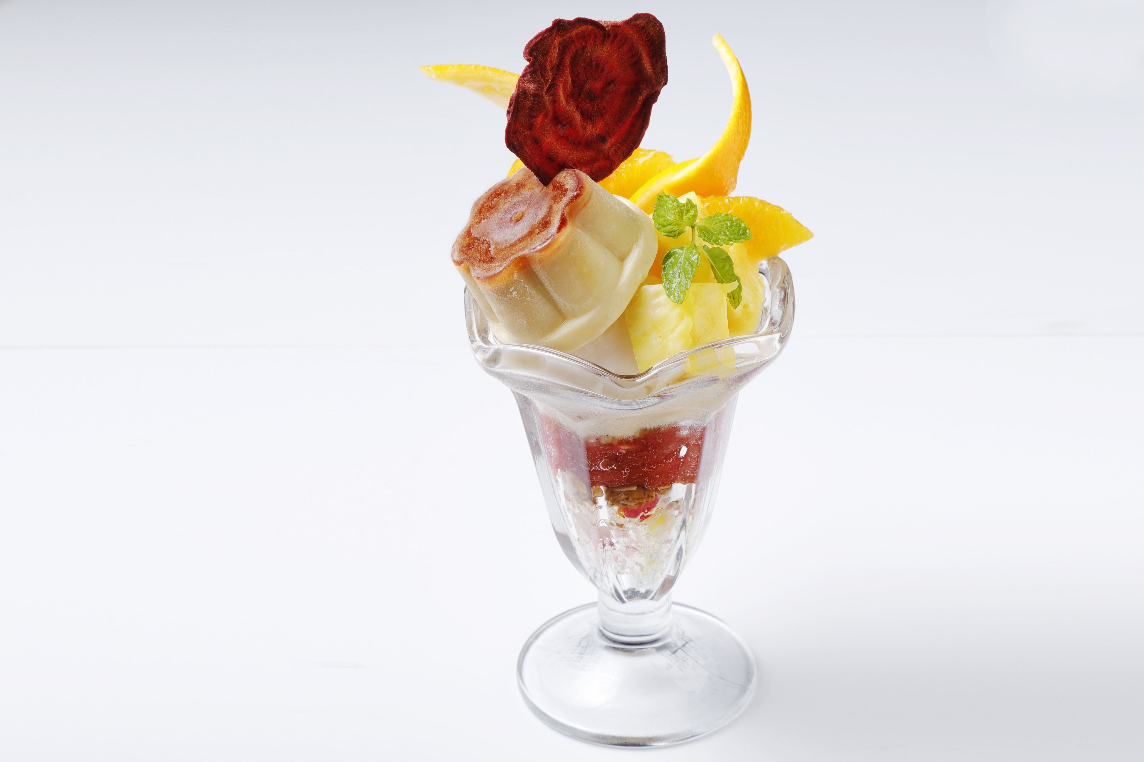 エディブルフラワーゼリー、グラノーラ、ルバーブジャム、ローストクルミ&アーモンド、プリンソース、ライチシャーベット、パイナップル、オレンジ、ビーツ、ミント