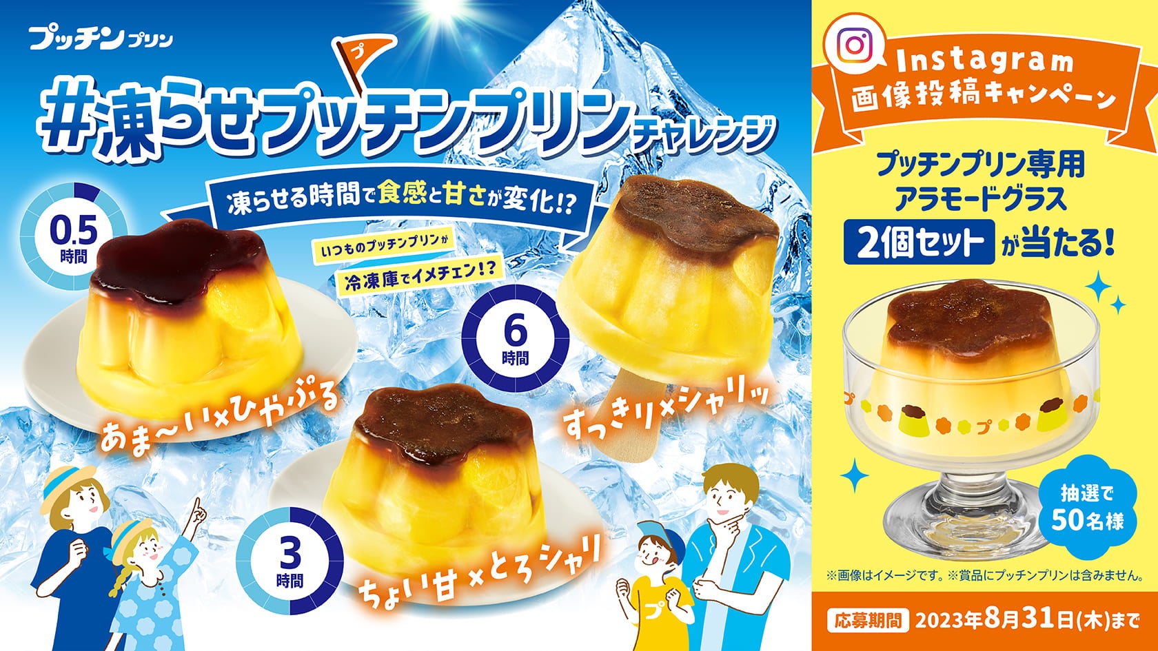 凍らせた「プッチンプリン」の写真や動画を撮影し、指定ハッシュタグを付けてInstagramに投稿すると、抽選で50名様にプッチンプリン専用アラモードグラス2個セットが当たるキャンペーンを実施中。