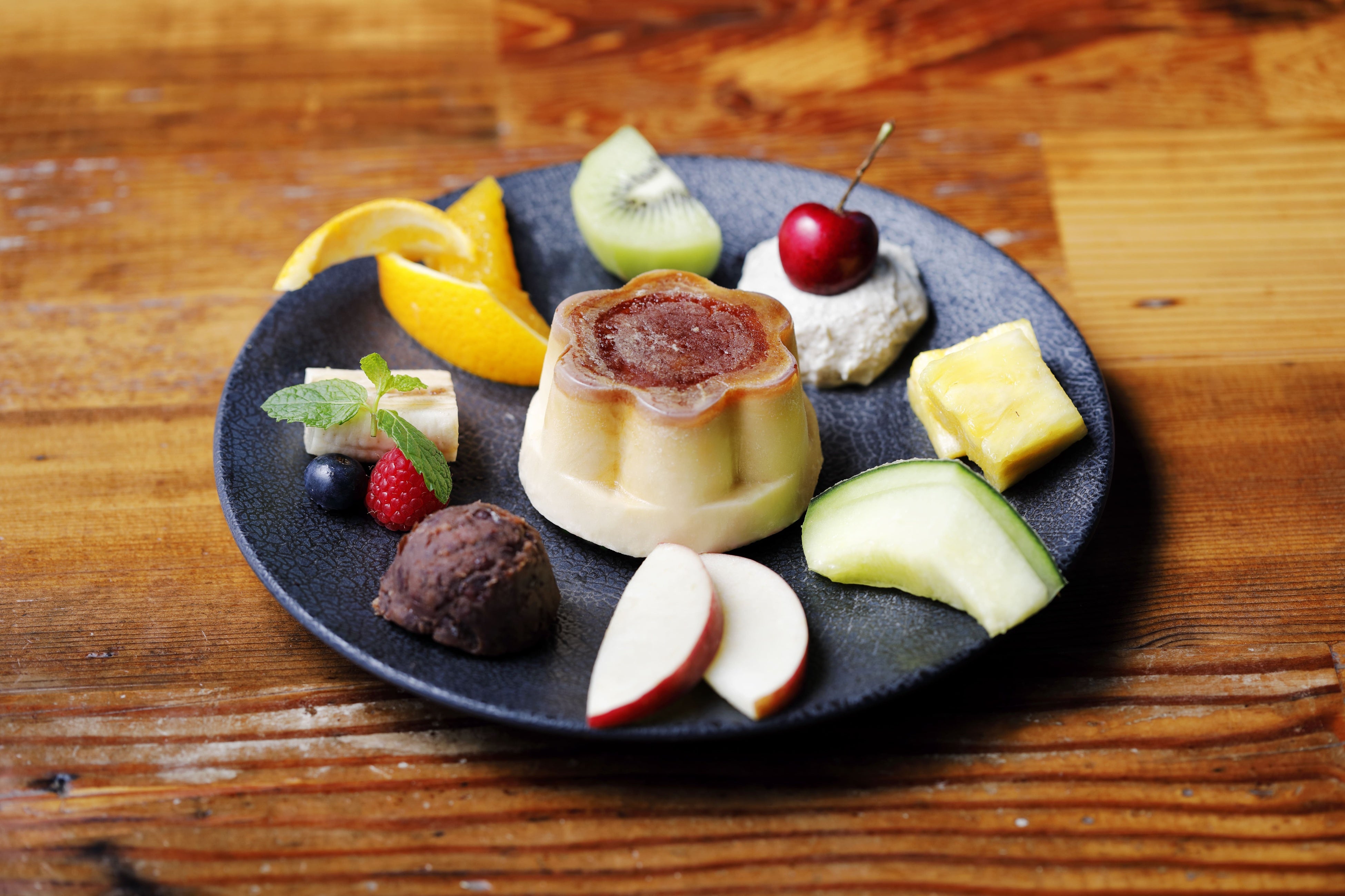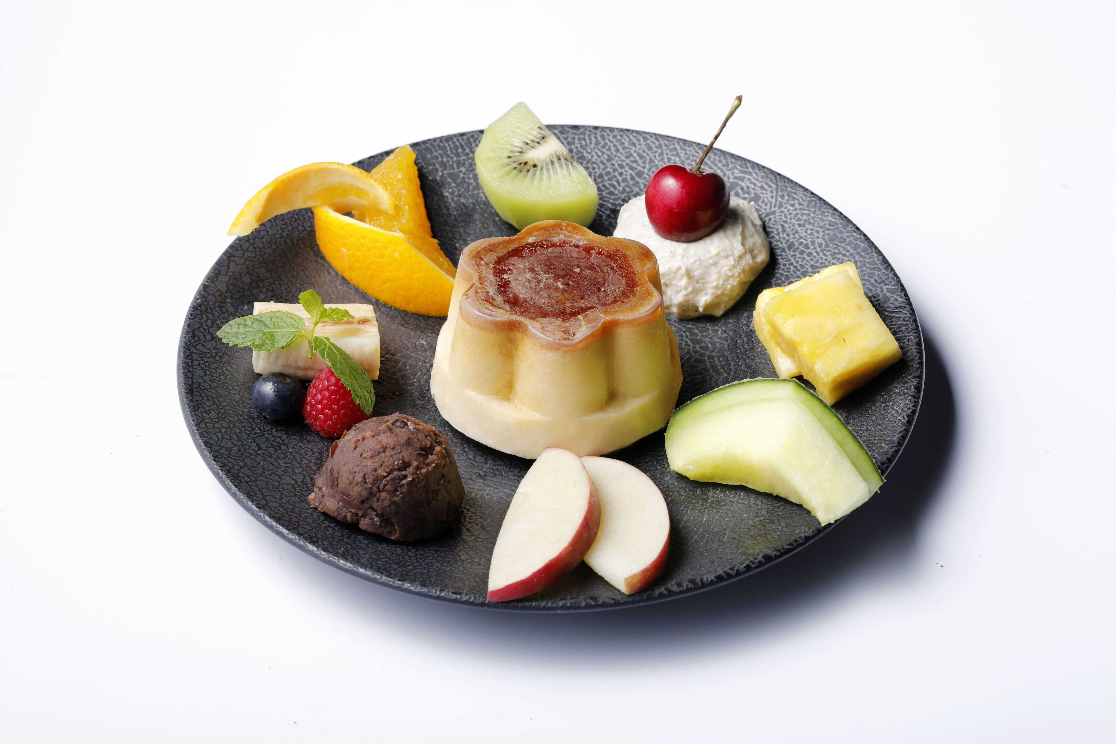 メニューをアレンジいただいたロイヤルガーデンカフェ&タバーン 豊洲の「植物生まれ=身体にやさしい ⇒ ヘルシーなア・ラ・モード」という考えのもと、プリンの周りを彩るフルーツには「植物生まれのプッチンプリン」を引き立てるフレッシュなものを使用。人工甘味料を一切使用せず、デーツ餡子はデーツとレーズンの素材そのものの甘さ、豆乳ゴマクリームはメープルシロップで甘さを表現しました。ロイヤルガーデンカフェ&タバーン 豊洲では、ア・ラ・モードは初めてのメニュー展開になります。