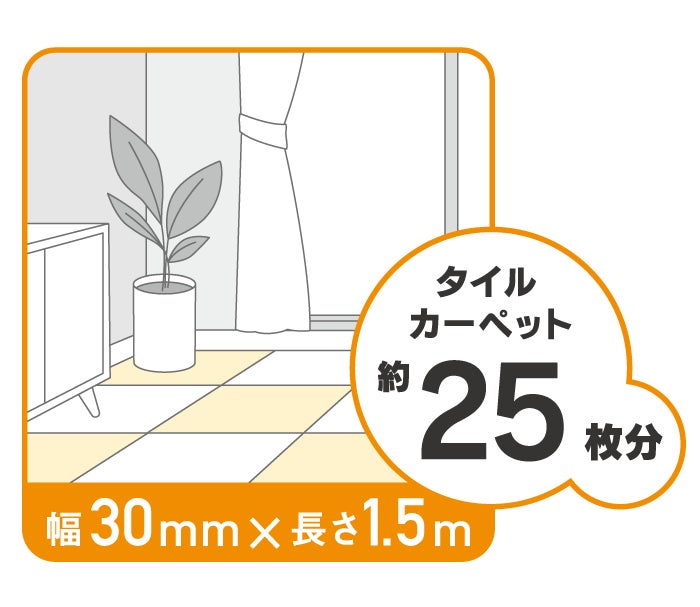 『タイルカーペット固定テープ 面ファスナータイプ』は、粘着剤と面ファスナーでタイルカーペットをがっちりと床に固定します。タイルカーペットの裏面中央に本製品をわずか6cm貼るだけで、50cm角のタイルカーペットを固定することができ、本製品1巻(1.5m)ではタイルカーペット約25枚(=約4.1畳)を固定可能です。