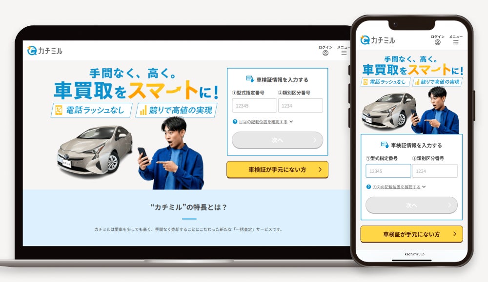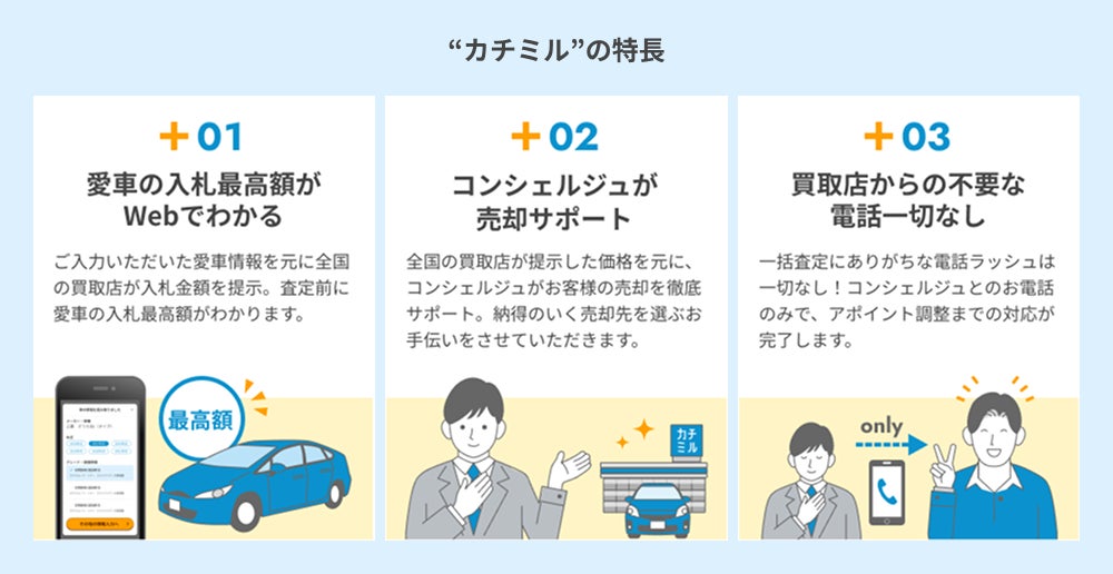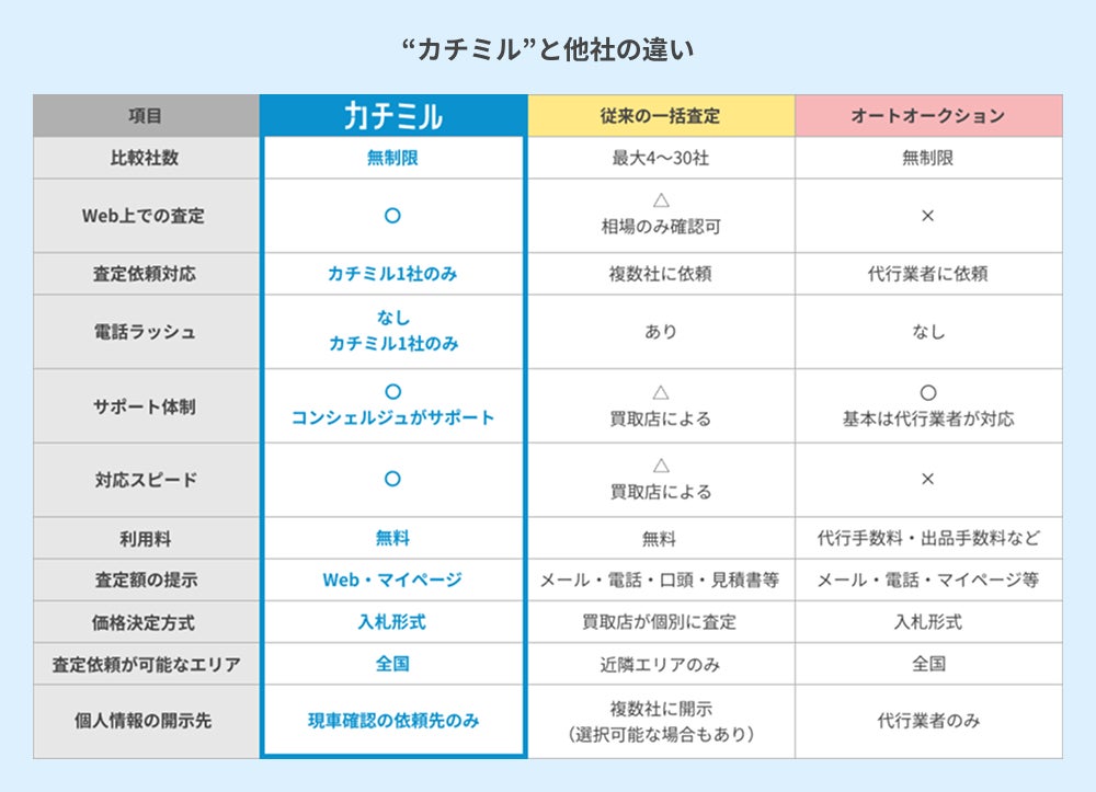 「カチミル」は、車検証番号と簡単な情報入力だけで、各社の入札価格(概算査定額)をWebでリアルタイムに確認できます。また、査定の依頼先はお客様自身が選び、その後の日程調整は「カチミル」のコンシェルジュ(電話オペレーター)にお任せいただけます。お客様は、お選びいただいた買取店に車を見せて、最終的な査定を受けるだけ!これにより、従来の一括査定依頼サービスの手間や負担を解消しながら、手軽な売却体験を提供いたします。