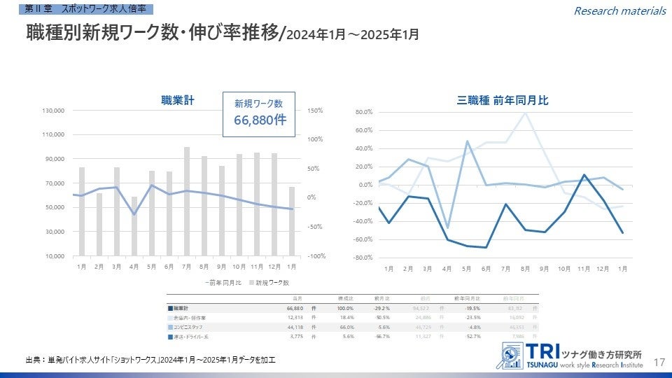 2. 新規ワーク数は66,880件で、前年同月比-19.5%と4か月連続で前年を下回る。