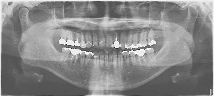 口、顎全体を1枚の写真に写すエックス線撮影では、むし歯や歯周病、のう胞、腫瘍、唾石、骨折など歯と顎骨の中の病気や、上顎洞(副鼻腔)の炎症有無などを診ることができます。