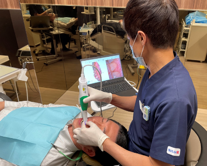 3Dスキャナを用いて口の中を撮影し画像でご確認する事ができます。歯型を取ることなく、鏡で見ることのできない歯の裏側やハグキの状態を画像で確認することができます。