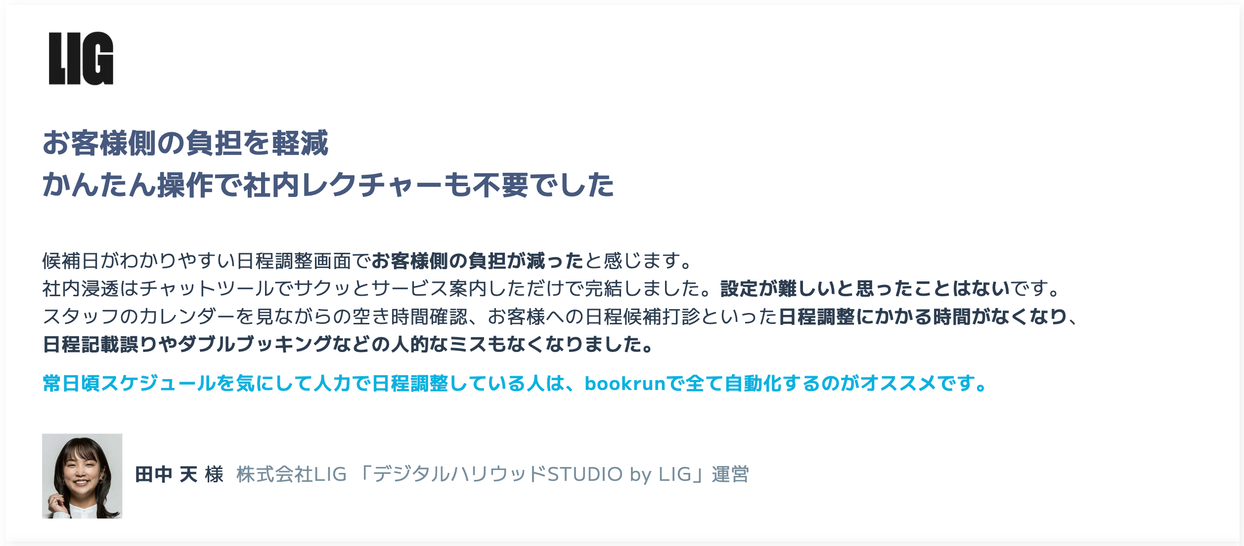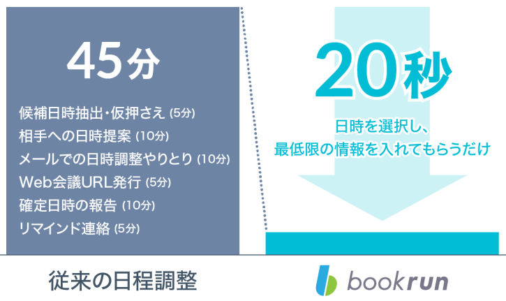 『bookrun』を利用することで、日程調整に必要なタスクが「調整相手に日程調整してもらうだけ」となります。ビジネス利用、プライベート利用のどちらでも、あらゆる場面で活用できる便利なツールです。ぜひお試しください。