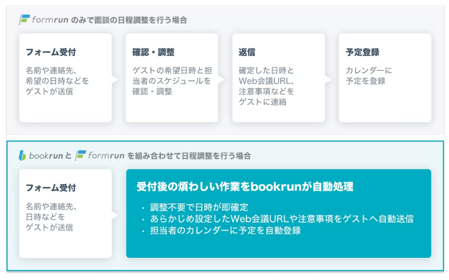 『formrun』と連携することでフォームで幅広い問い合わせの取得と日程調整まで完結