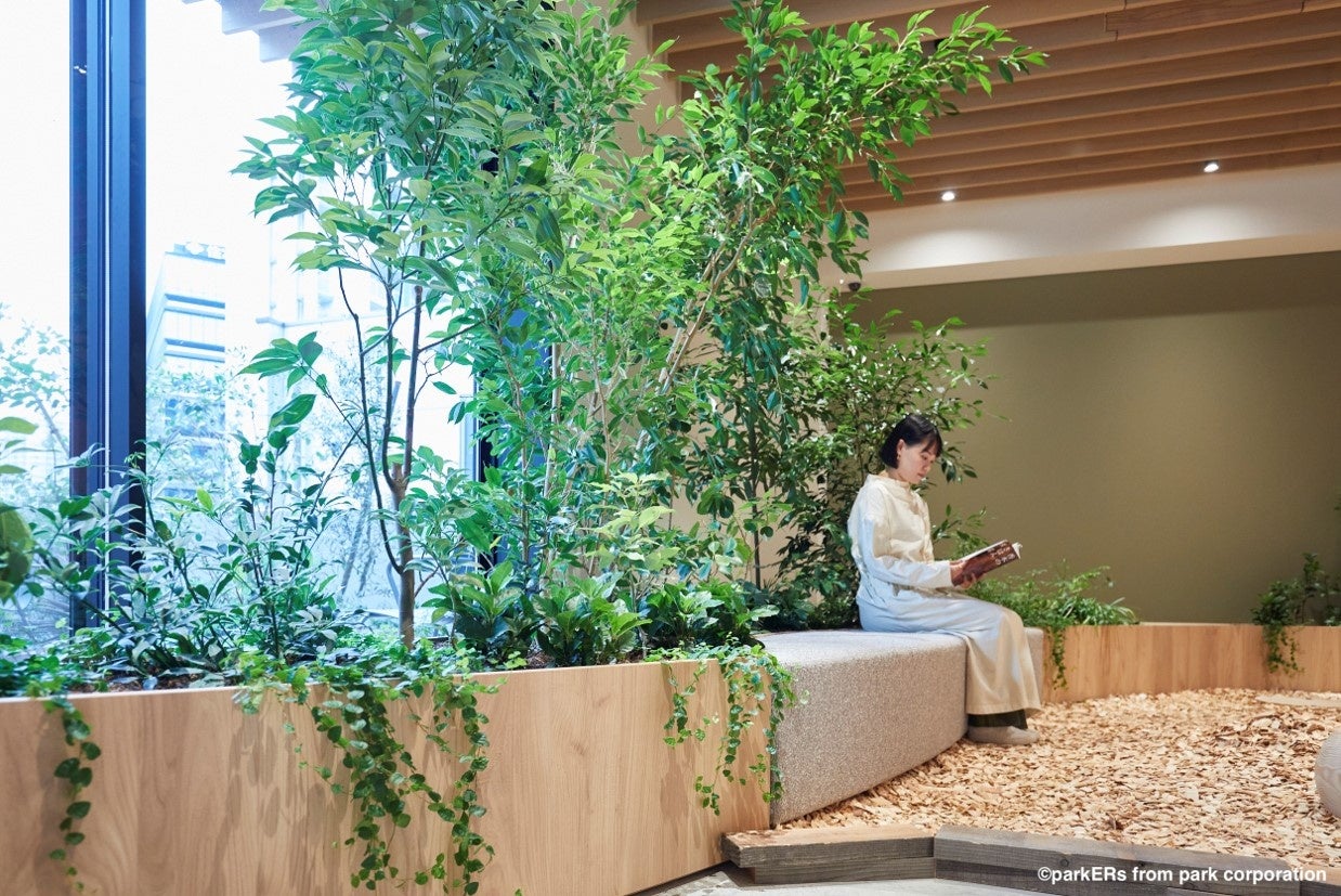 「木」の取り組みとして特徴的なものが、2階ラウンジです。植物の専門家と空間デザイナーによりる「公園のようなここちよさ」をデザインする空間デザイン事業部事務所「parkERs」がインテリアを監修します。大木でつくるテーブルは、樹齢160年のスギの元玉をまるごとと樹齢200年のヒノキをそのまま使用したもので、東京都の檜原村で林業を営む株式会社東京チェンソーズが育てた東京都檜原村のと手掛けたものを使用していまです。東京チェンソーズが所持する東京都檜原村から届いたものを使用しています。また、ラウンジ内の緑化にも注力しており、森で見られる木々の連なりや切り株から芽生えた命といった、自然の中で感じられる要素を随所に散りばめデザインしております。樹木の使用部分や産地等、木にまつわるエピソードを視覚的に伝えるサインも設置しております。温もりを感じる木のをそのまま使用した家具や植物木々と触れあうことで、自然への感受性を高め、五感を使って楽しむることができる心地よい日常体験を提供いたします。