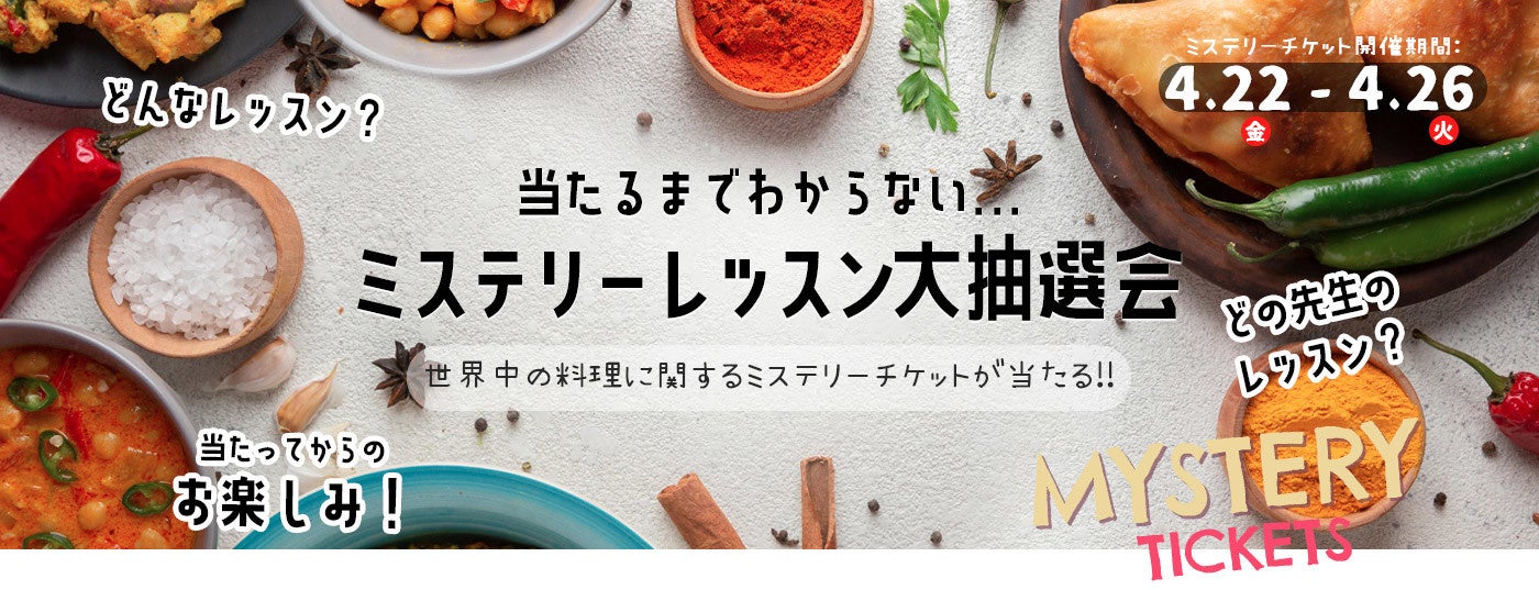 今回は、上記「おうちクッキングで世界旅行!」特集で掲載されている単発レッスンを対象にミステリーチケット抽選会を開催します。