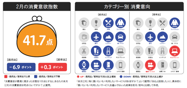 2021年2月の消費意欲指数は41.7点。前月比-6.9ptの低下、前年比+0.3ptと横ばいのスコアとなっています。